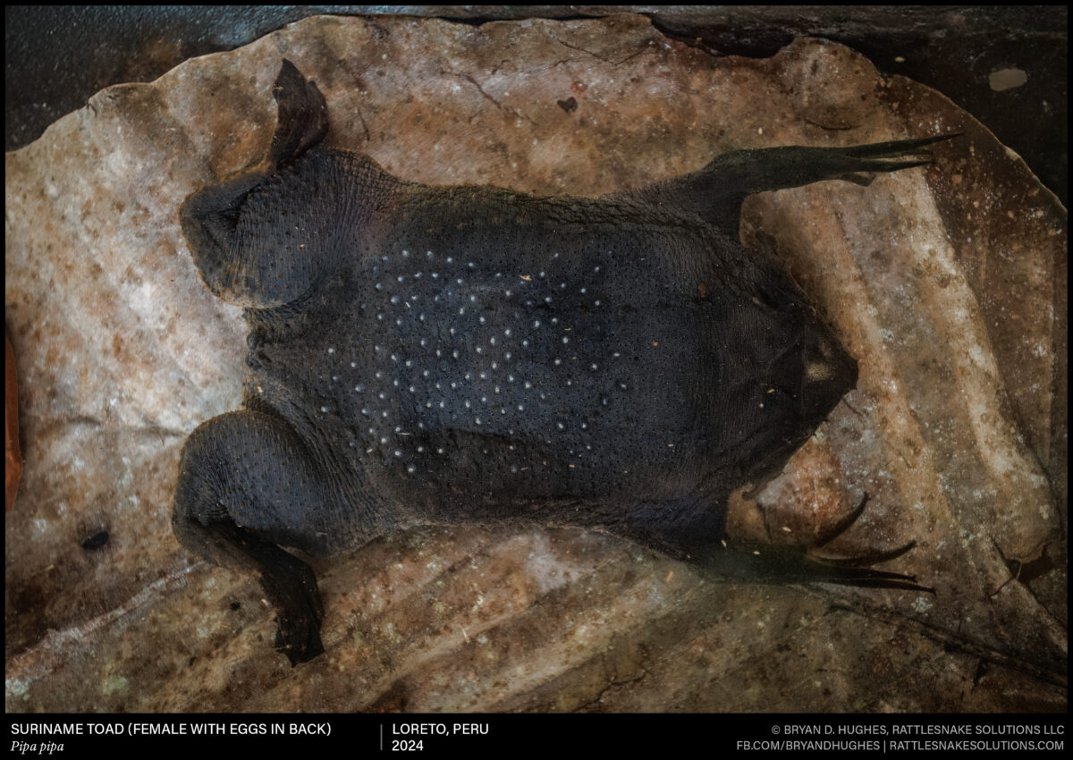 This is a Pipa pipa (Surinam Toad) I photographed in Peru a couple of weeks ago – there were a lot of them! They’re entirely aquatic, and have a crazy reproductive process. After mating and eggs are ready, the male squishes them into swollen tissue on the back of the female (those white dots in their little back sacks. The eggs sink into the skin, and ride around with her for a few months. When they are ready to hatch, full little frogs (not tadpoles) emerge right from their mother’s back. What is more interesting to me is that at some point in the eggs-n-back part, the embryos are surrounded by highly vascular tissue, suggesting that nutrients and oxygen are transferred from the mother.