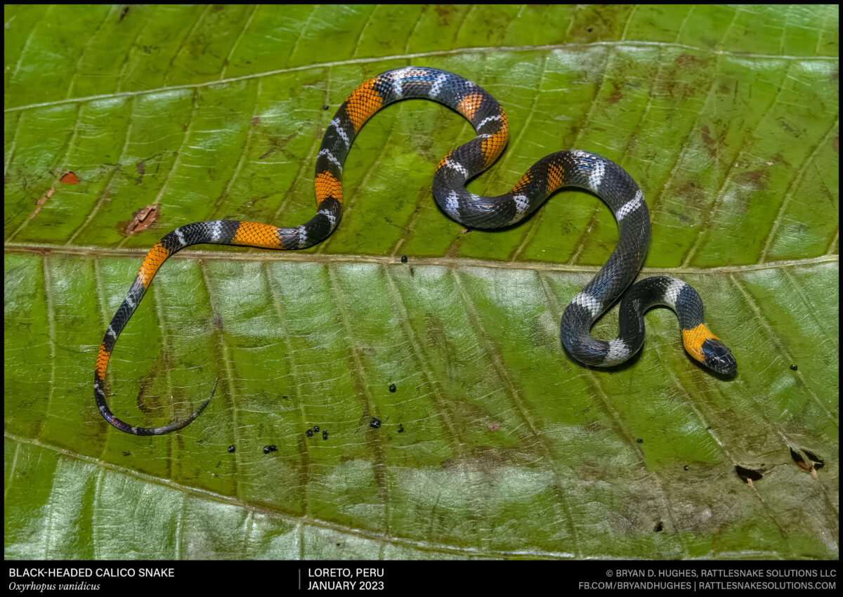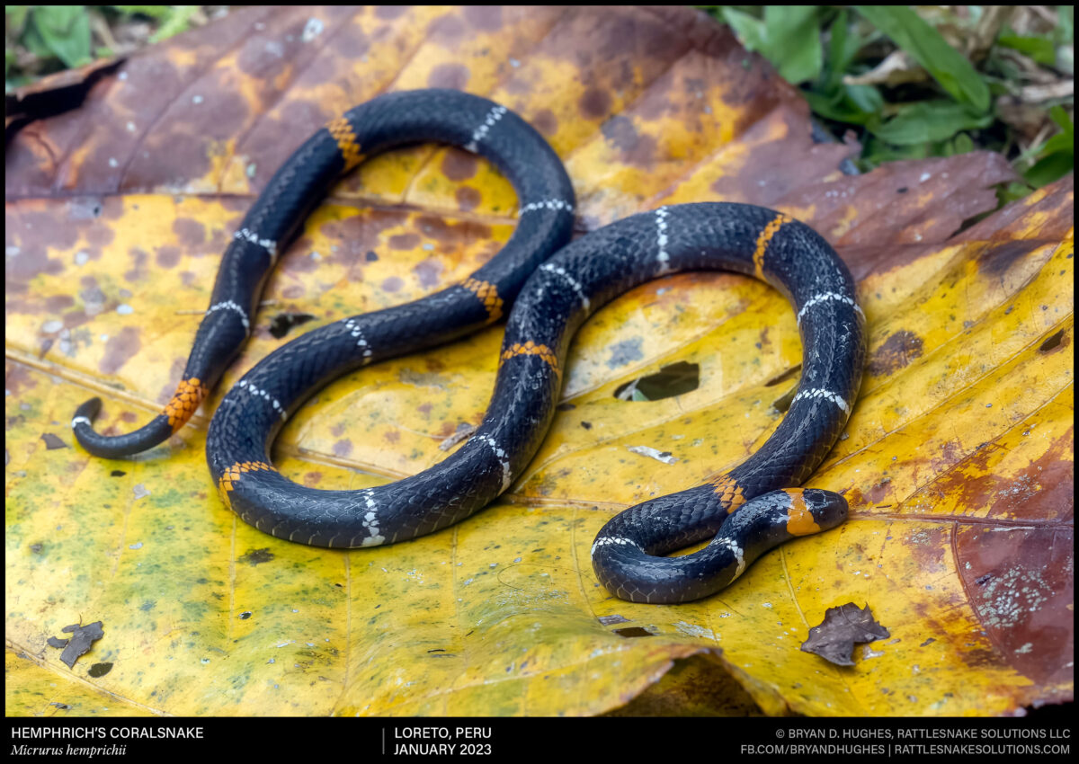 One of the many species of coralsnakes that can be found in the matrix of materials that make up the floor of the Amazon rainforest. This is a Hemprich’s Coralsnake. Also, its mimic, a harmless Black-headed Calico Snake. The body and head shape, as well as details of the pattern, are pretty different in a lot of ways, but it’s more than enough to make you think twice about reaching for one on a late night jungle hike when you see a black and orange flash in the leaves.