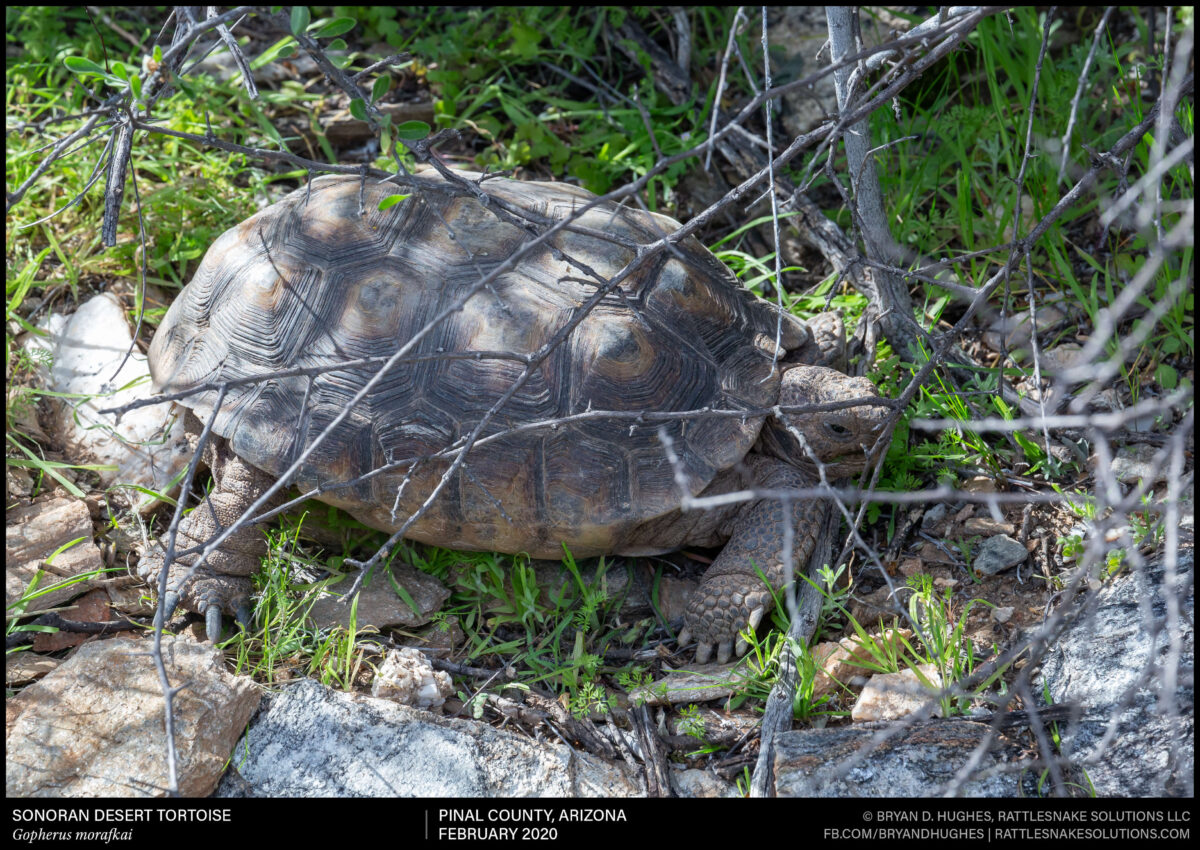 A Sonoran Desert Tortoise cruising around the rocky outcrop it calls home each Winter. It shares the space with a few Western Diamondback Rattlesnakes and at least one Gila Monster … and a beehive.