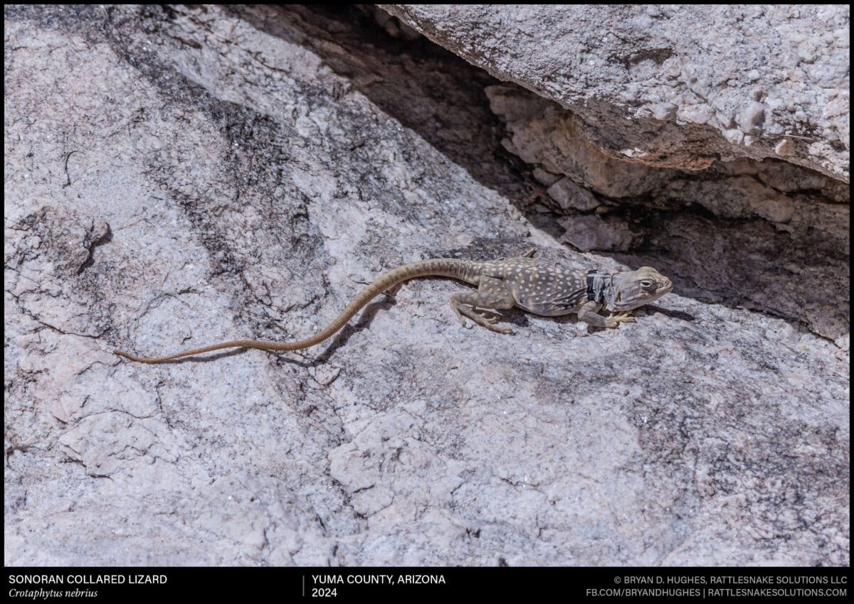 Sonoran Collared Lizards (Crotaphytus nebrius) are generally less brilliantly colored than their bright green relatives north of the Gila River. They can be standing tall on top of rocks on hillsides and outcrops, even in the heat of an Arizona summer day. When they are startled (which can happen from a disappointingly long distance) they can escape quickly by running on their hind legs. They have powerful jaws and consider about anything small enough to fit in that big head as food, which often includes other lizards. Personally, the image of large, fast, bipedal lizards that hunt other lizards fills that “I wish dinosaurs were still here” void just a little.