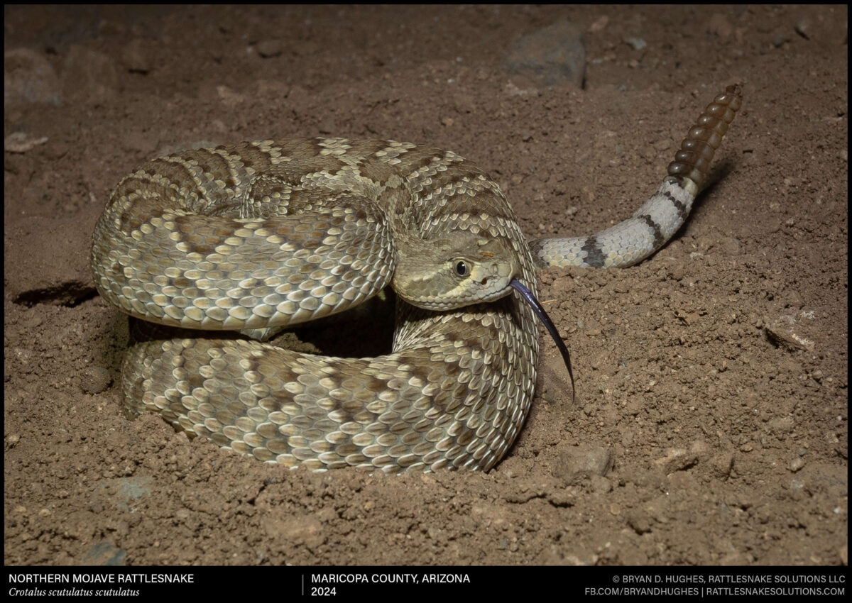 A Mojave Rattlesnake from the Phoenix area. These snakes are common in the flatter, creosote and grassland areas of the state. This one obeys the all the ID rules, with much wider white tail bands than black, yellow proximal rattle segment, and a post-ocular stripe that extends back to never intersect with the mouth.