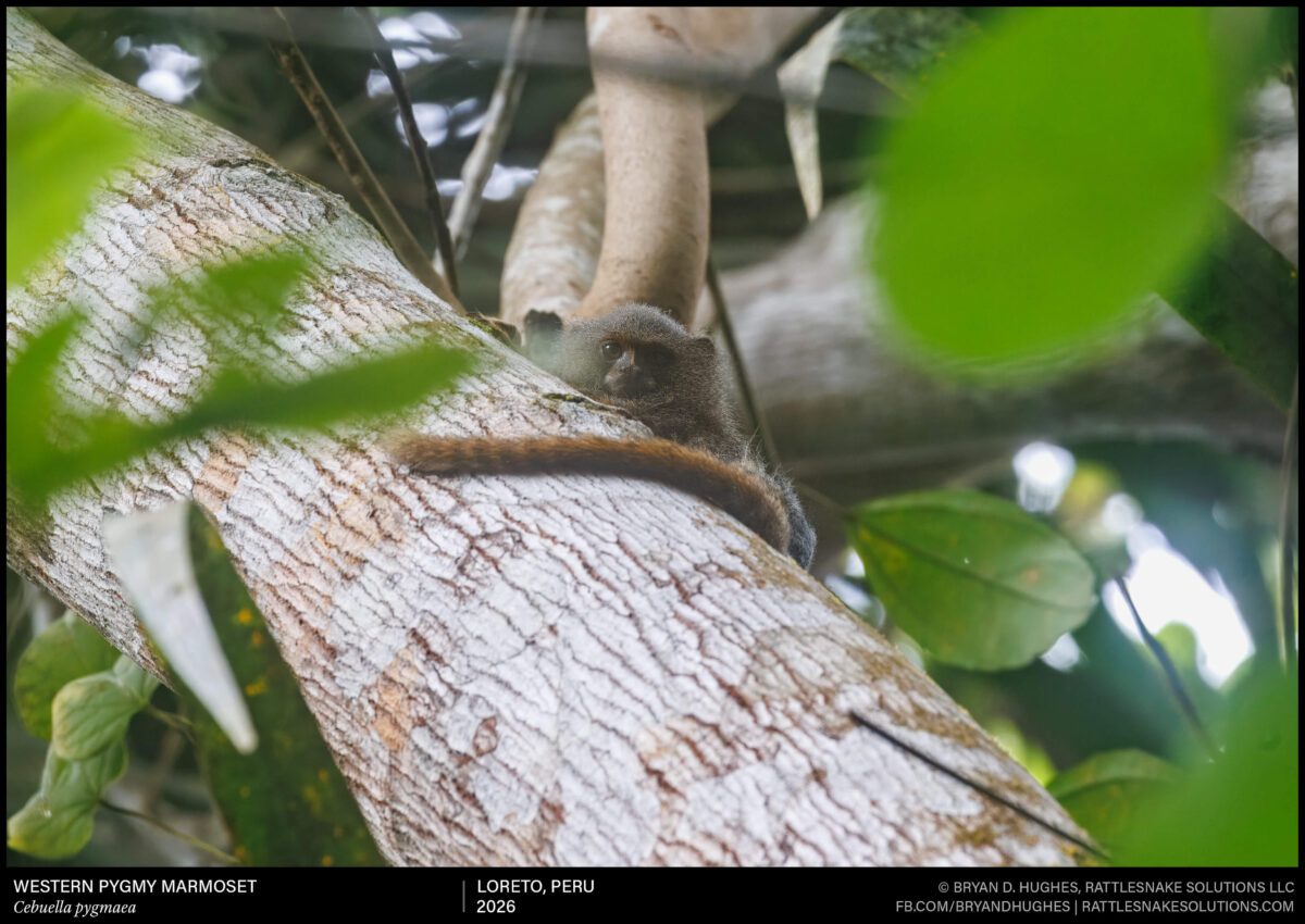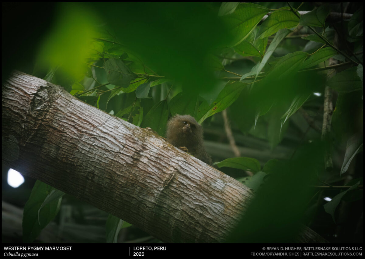 We were shown these amazing little primates, the smallest in the world; Western Pygmy Marmosets (Cebuella pygmaea). Each is only about the size of a hand, with the smallest we saw likely comfortable curling up in a donut. They stay in one tree and have a tiny home range, excavating holes in bark to get to the sap they eat. They were skittish but as they didn’t go far, relatively easier to photograph than other primates in my experience. Loreto, Peru.