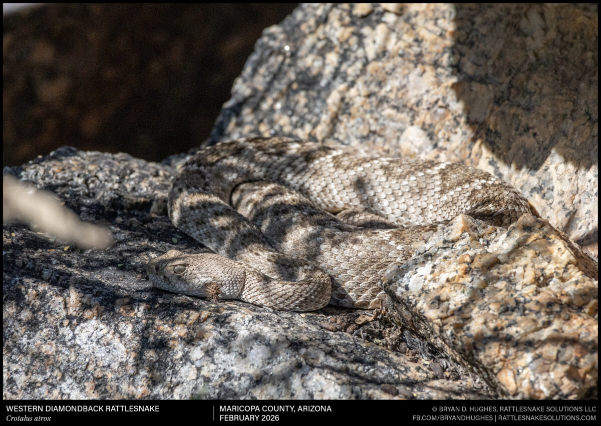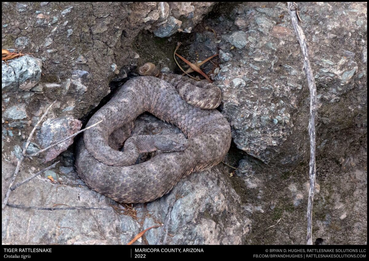 A Tiger Rattlesnake found in a very heavily visited park. This old snake is one of just a handful of Tiger Rattlesnakes that are known to remain in the park, and likely is very good at evading detection by hikers. This deconstructed, purple-ish tone look is typical for the species in the area. It now carries a PIT tag that will confirm its identity on future sightings.