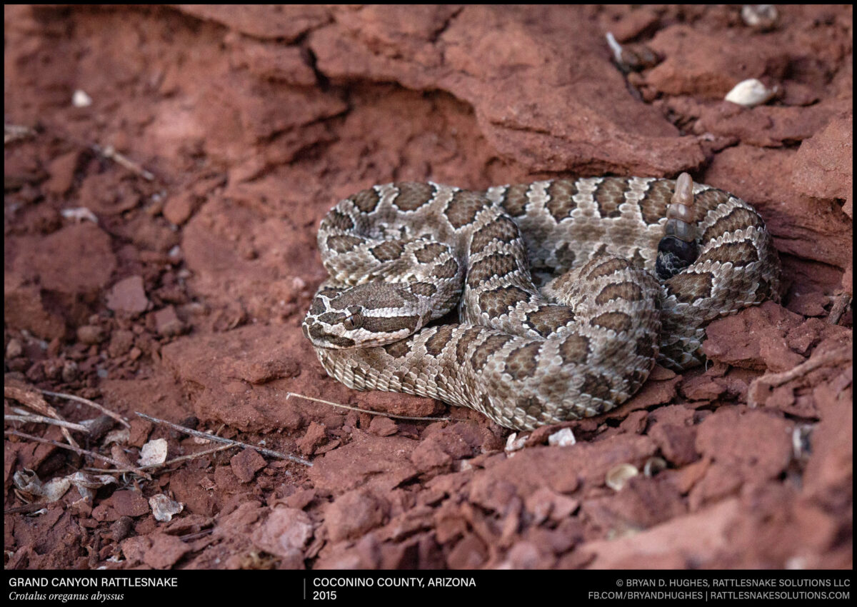 A young Grand Canyon Rattlesnake I found near its namesake a little over a decade ago. As this snake matures, the clean pattern of its head and body will fade and degrade to a series of dark splotches and smudges against a simple background.