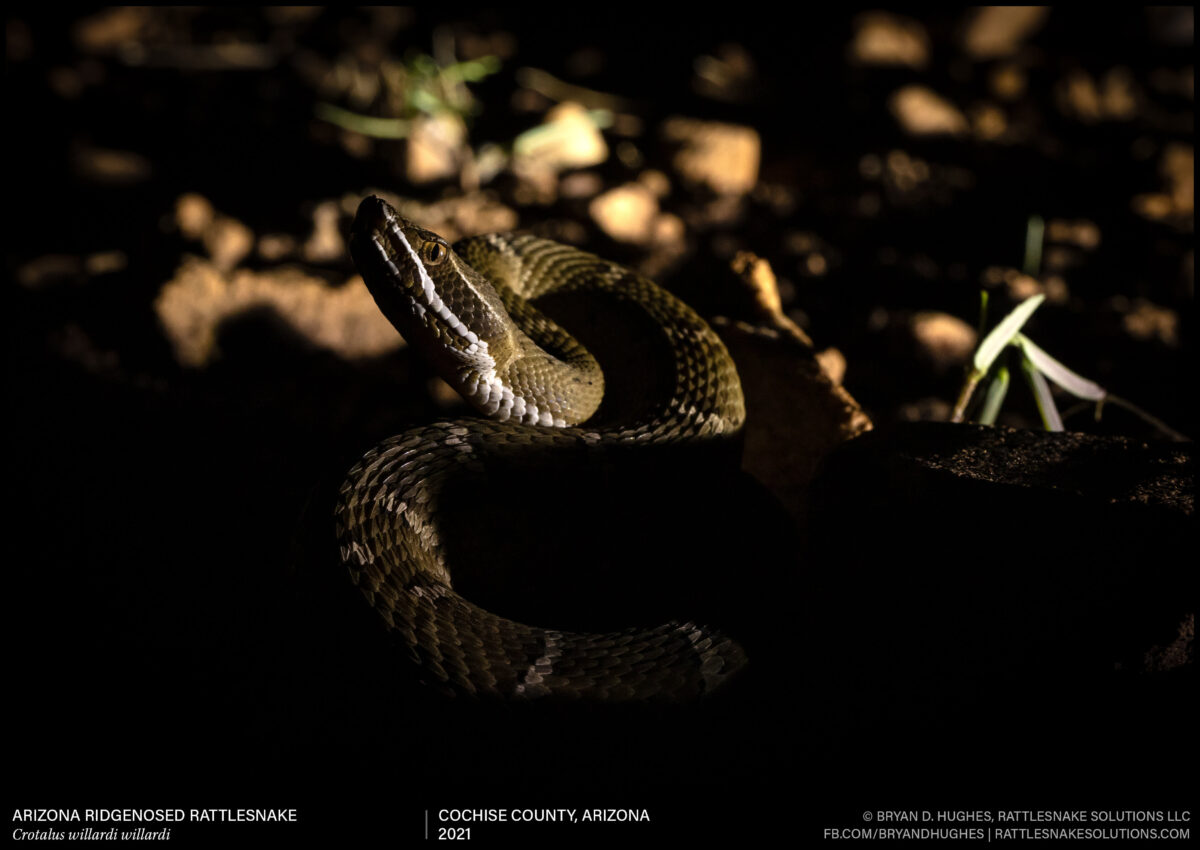 Arizona Ridgnosed Rattlesnakes are common in a few mountain ranges in southeastern Arizona, but not found in the desert environments where most people live. They are usually seen by hikers and wildlife observers in the daytime, but often found moving at night as well.