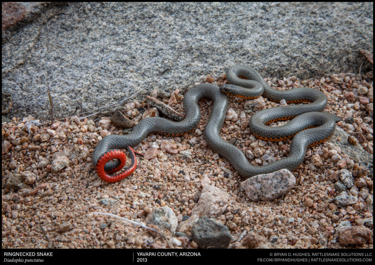 A Regal Ringnecked Snake we found in central Arizona many years ago. These are venomous, but harmless, eating a wide variety of prey from invertebrates to other snakes. The red color under the tail, which is shown here in defensive display, is just a hint at the bright colors that run the length of the belly.
