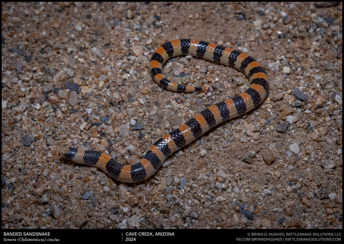 A Banded Sandsnake from my own backyard. These are tiny, even as adults. This one is a bit shorter than a pencil, and likely won’t get any bigger. They eat invertebrates, don’t bite, and are completely harmless to people and pets. They’re also very often mistaken for Western Groundsnakes, which look superficially similar.