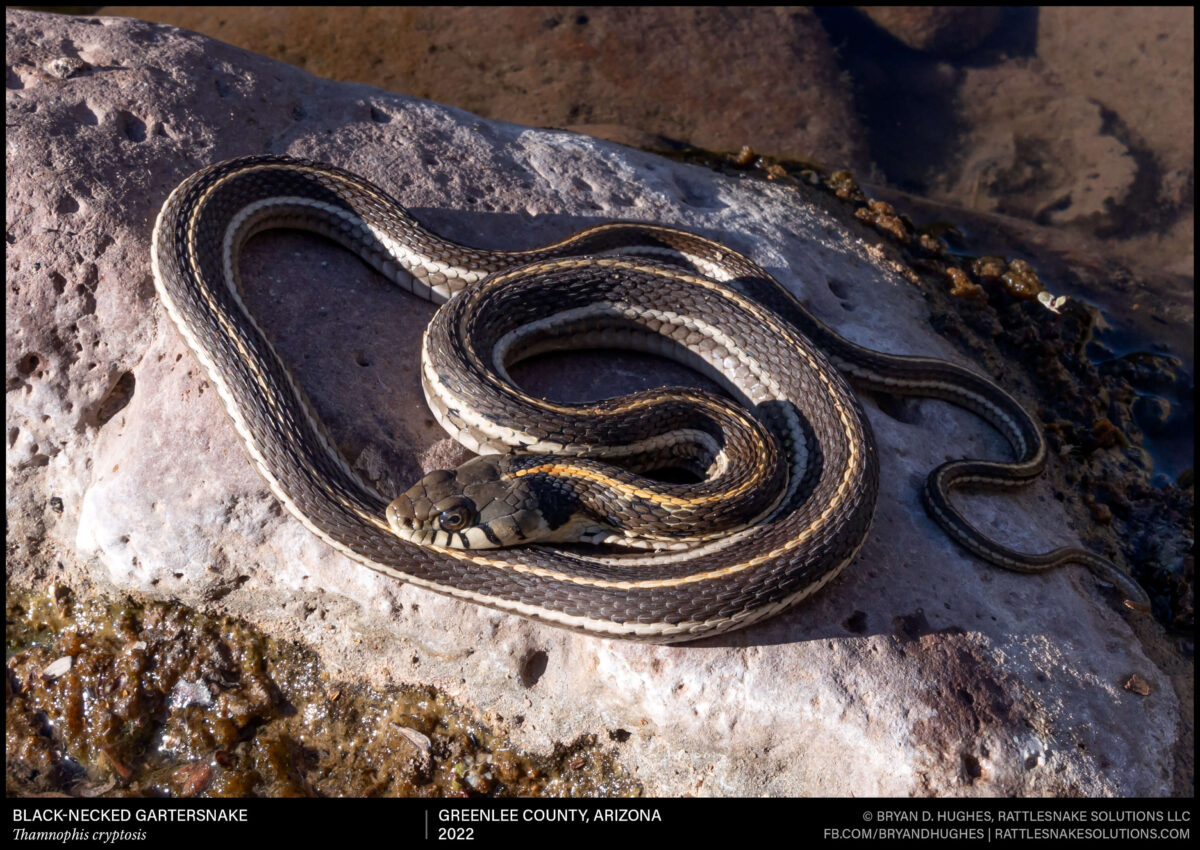 A Black-necked Gartersnake we found while hiking a high-elevation stream in Greenlee County, Arizona. This one had lost its pattern entirely, becoming solid grey animal with stripes and its characteristic black patches behind the head.
