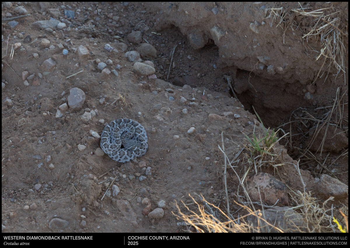 A neonate Western Diamondback Rattlesnake was spotted coiled near the rodent burrow it has been hiding out in during its first weeks of life. This was in July of last year, so it had to have been born pretty early in the season, relatively, to be by itself at that point.