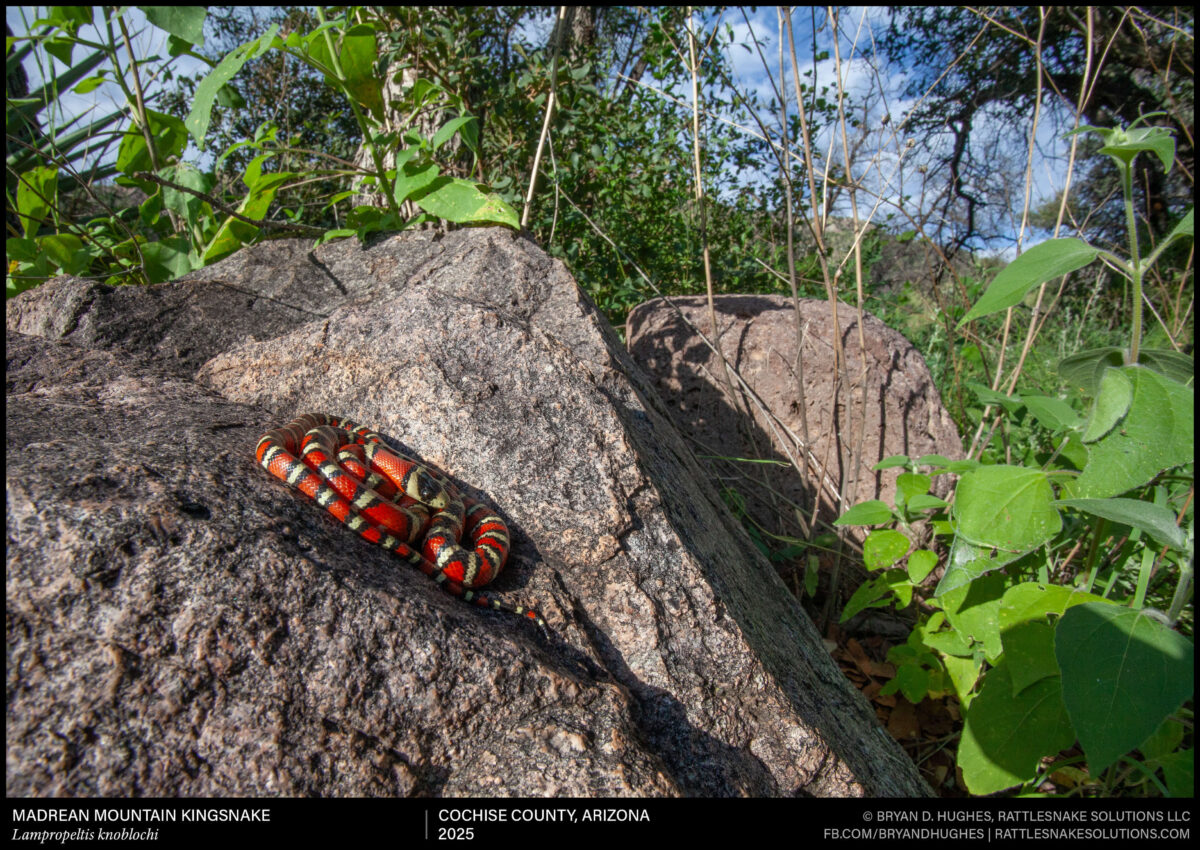 A small Banded Rock Rattlesnake in ambush along the base of a boulder in southeastern Arizona. The pattern and bands break up its shape, making it difficult to see in context. This is a good way to catch one of the many Yarrows Spiny Lizards jumping around on the same rocks each morning.