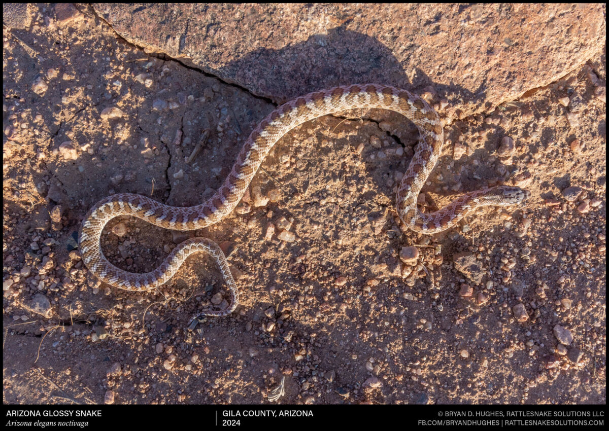 We found this young glossysnake in Gila County on a warm evening. Often, Sonoran Gophersnakes are misidentified as this species. One notable trait to differentiate if up close is in its name. Sonoran Gophersnakes have a ridge (keel) in each scale that gives them a rough texture and appearance, and the Glossysnakes have no such keel, and look smooth and shiny in comparison.