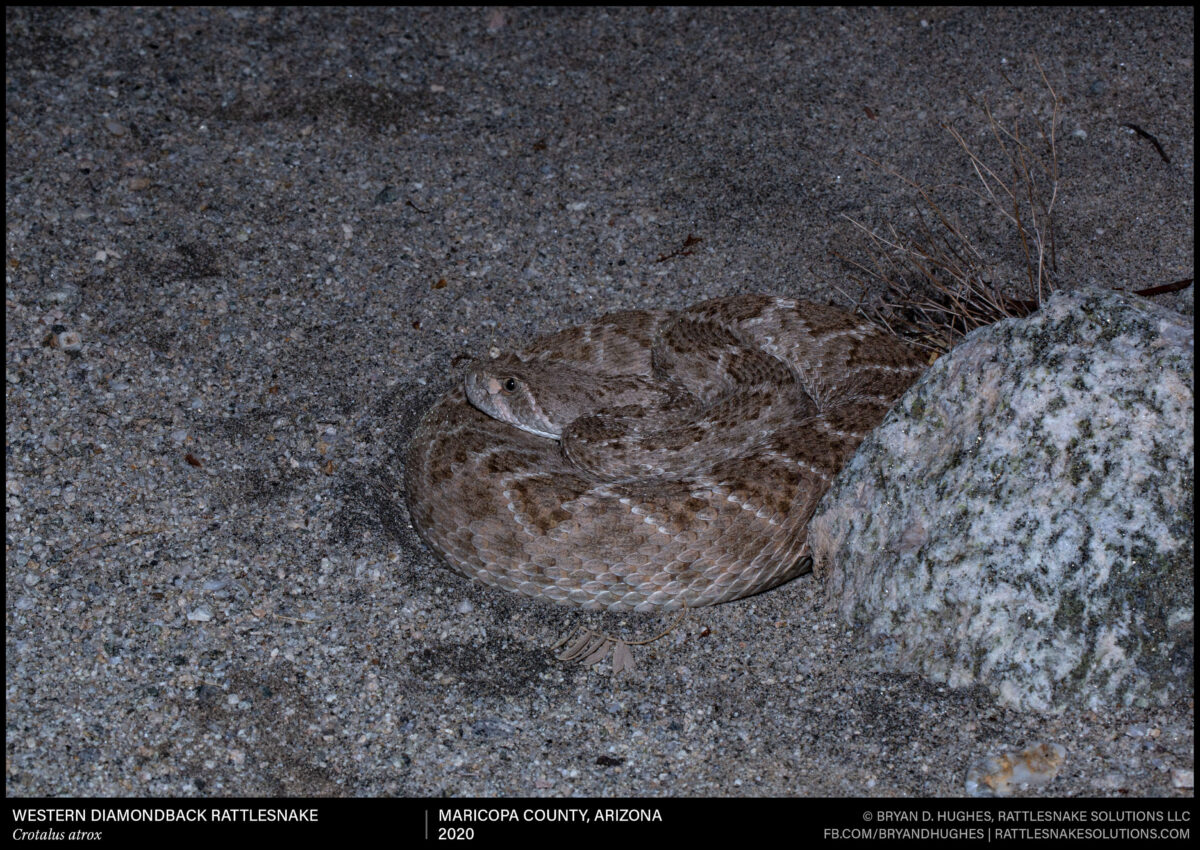A Southwestern Speckled Rattlesnake hanging out in a drainage, as it does about every morning, during the lethally hot period of Arizona summer. For much of the year, rattlesnakes are largely nocturnal, encountered by hikers and homeowners only just after sunup and again after dark.