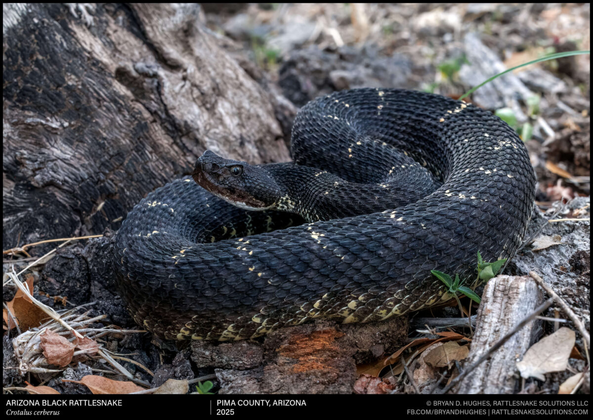 An Arizona Black Rattlesnake found in mid-elevation oak woodland near Tucson. This species of rattlesnake can change color in a relatively short amount of time, often appearing much lighter and heavily patterned at night, and transitioning to this inky black in the light. Other factors, such as social interactions and mood may also affect this shift.