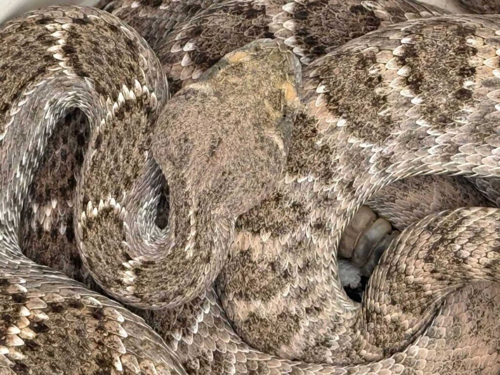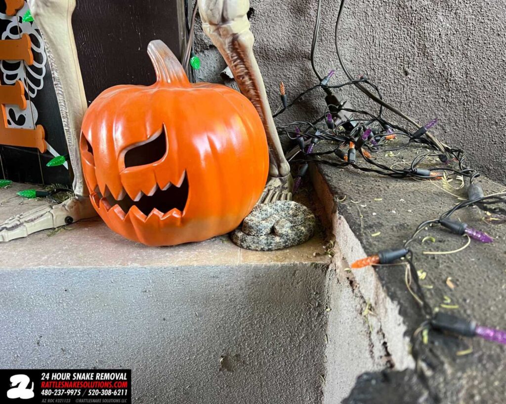 Just a reminder – any decoration that looks like a snake may be a real rattlesnake. We were called to get this speckled rattlesnake hiding in the decorations last Halloween.