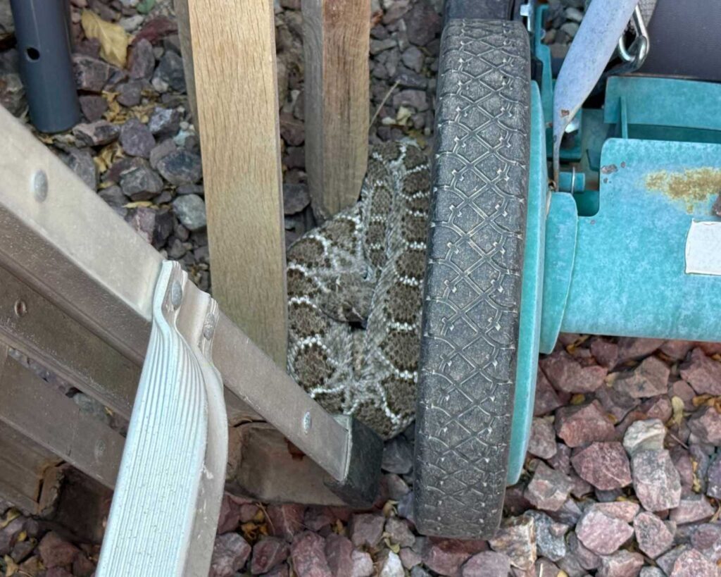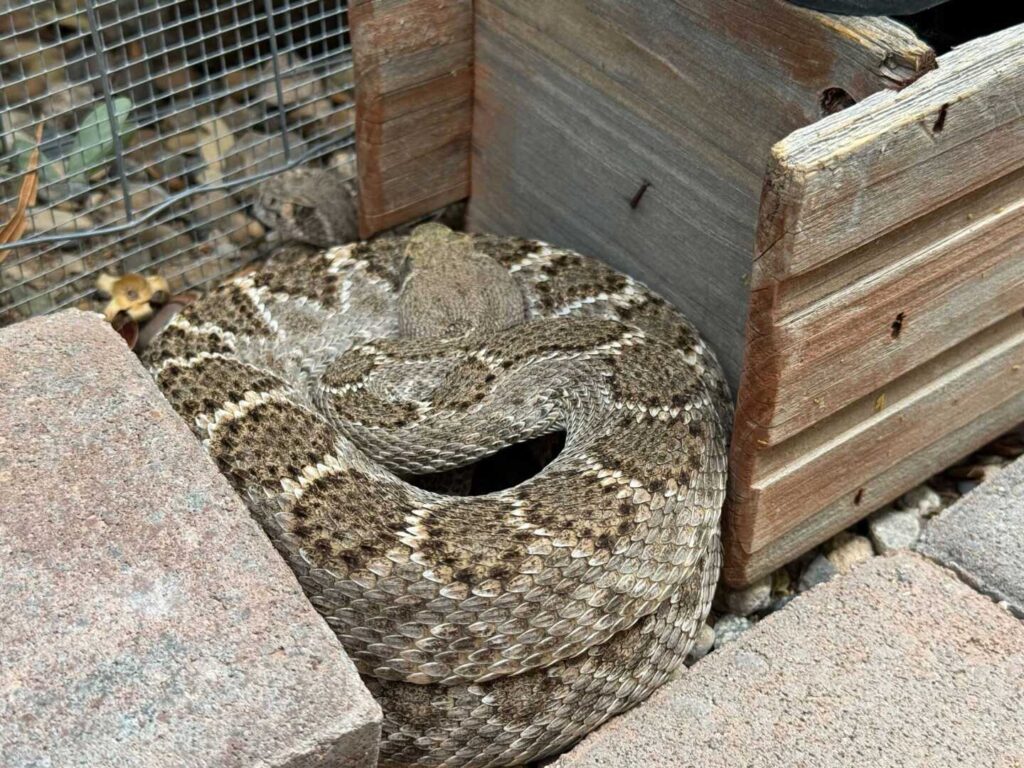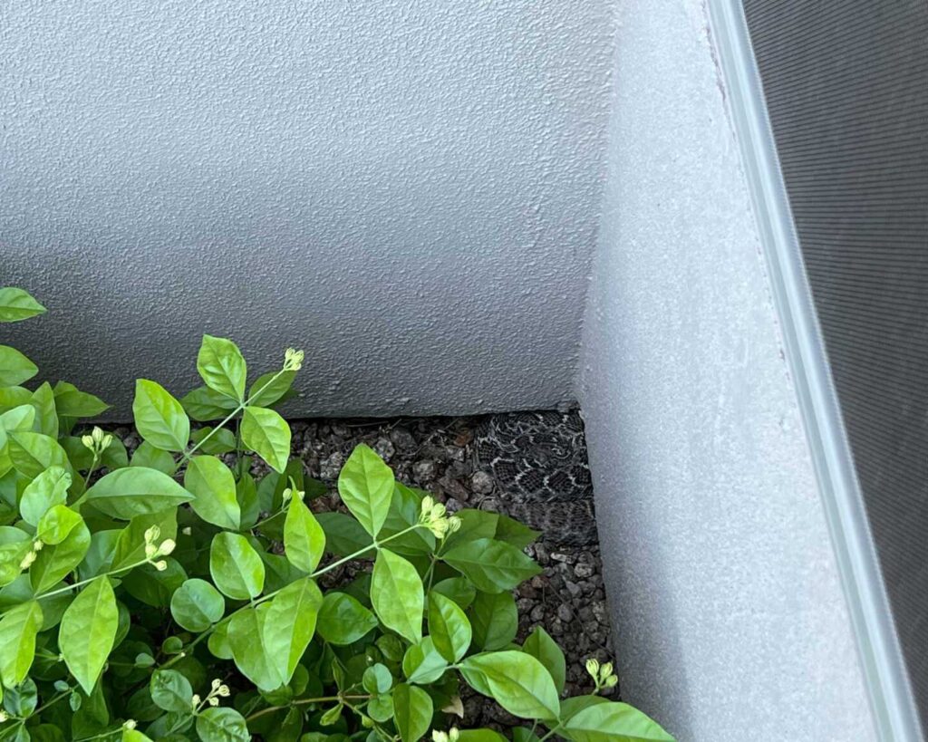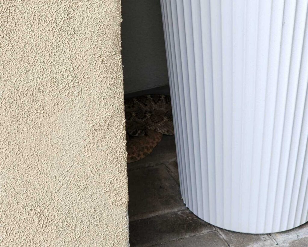 A Western Diamondback Rattlesnake coiled up behind a pot by the front door. These situations are easy hiding spots that snakes can use to get out of the sun for the day. Cheyenne helped this one get to better surroundings.