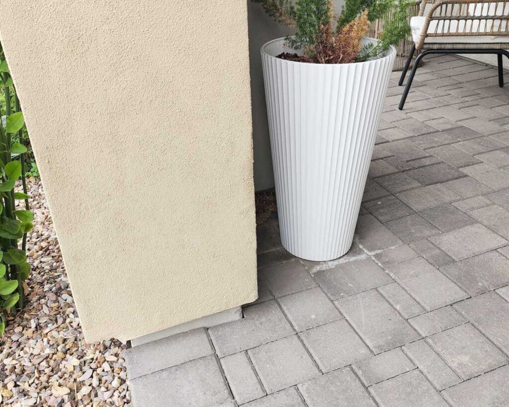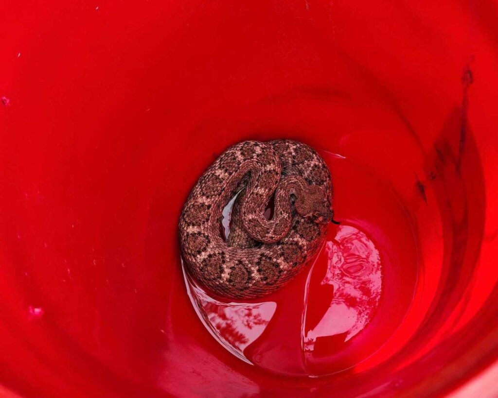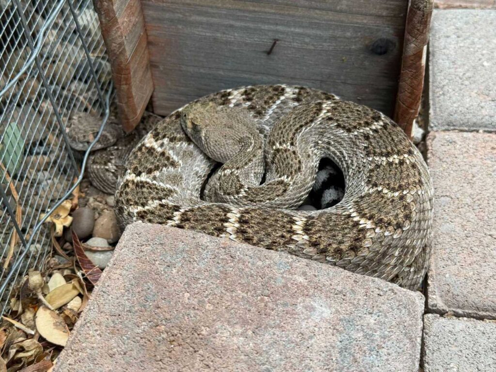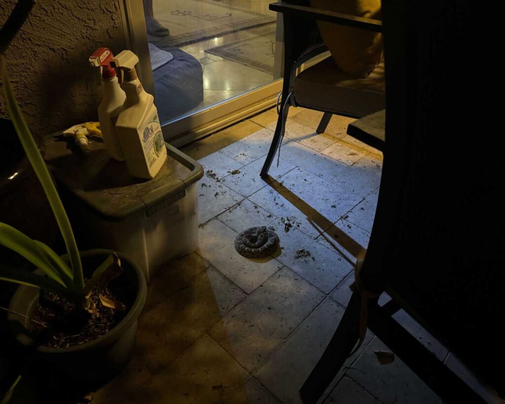 A Western Diamondback Rattlesnake coiled up behind a pot by the front door. These situations are easy hiding spots that snakes can use to get out of the sun for the day. Cheyenne helped this one get to better surroundings.