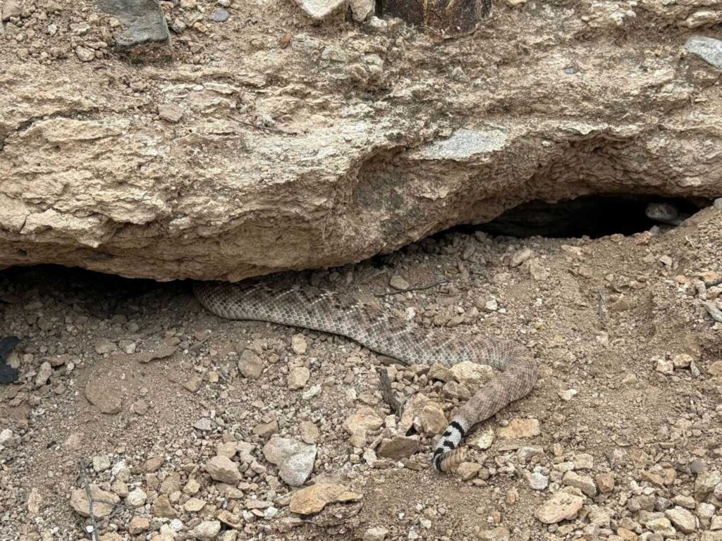 On the release, I was careful to find a spot that emulcates the situation of capture – a suitable winter den. I went to an area where this would be likely, within the snakes estimated home range, and started searching. Within a relatively short amount of time I found a adult Western Diamondback Rattlesnake coming out from a dense packrat nest on a south-facing ridge – perfect. The garage snake was released here, a much better situation than it had been in before.