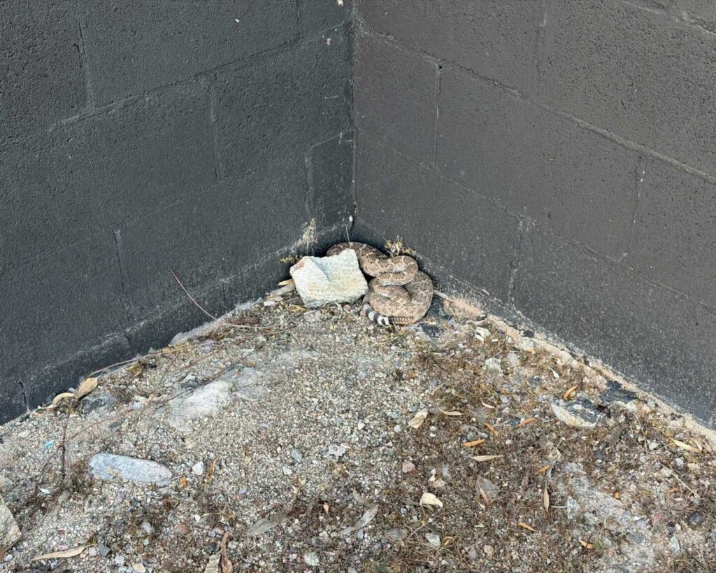 First call of the year for CJ was hard to get a photo of in situ. The caller spotted this Western Diamondback Rattlesnake poking around their neighbor’s porch before it settled into the eave of the house behind an aloe.