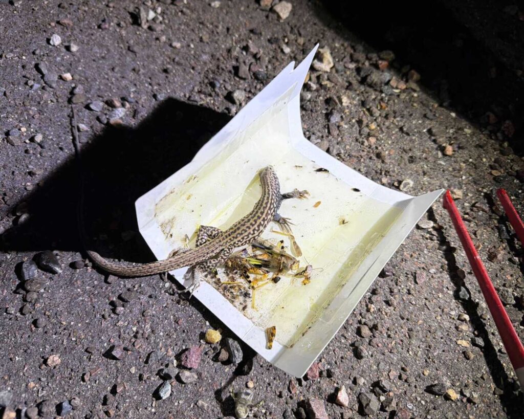 A pair of Tiger Whiptails were found in a gluetrap and mistaken as snakes. Austin was able to very carefully free them from the trap to release them in a safer spot. These harmless lizards eat a variety of invertebrates, and would remove many more of the intended target than the trap ever would, so the net return on these kinds of traps is not people might expect.