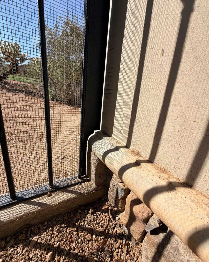 A tight installation of rattlesnake prevention materials to this patio gate from Daylan and Elias. It’s a shady spot by design, which can’t be ignored by wildlife that are also looking to get out of the heat. Covered patios emulate natural locations where rattlesnakes can naturally be found aestivating during the summer, and snake fencing is an effective way of making sure there are no surprises.