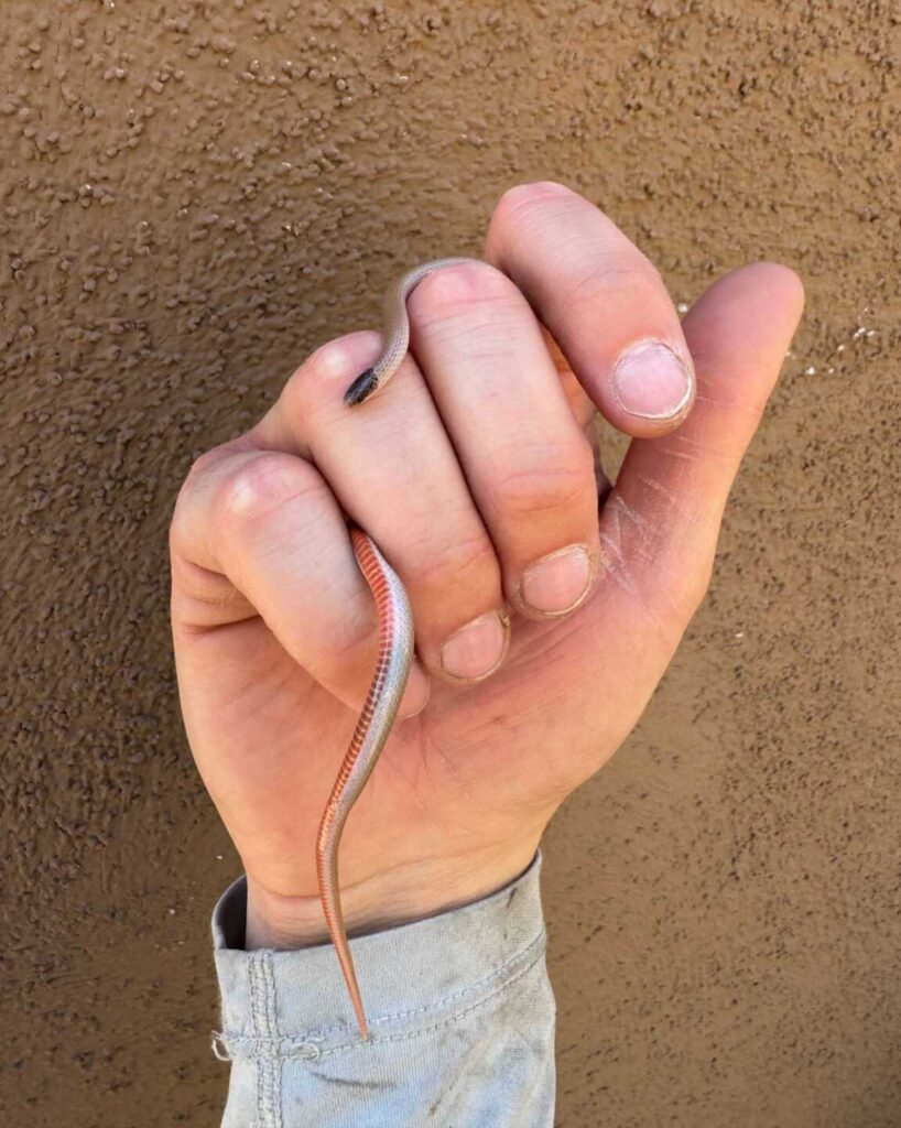 Josh found this little Smith’s Blackheaded Snake while working on a Rattlesnake Fence near Tucson the other day. This isn’t a baby – they’re tiny animals, which eat even tinier ones (invertebrates). They’re entirely harmless, and the snake was just moved to suitable habitat out of the way so it wouldn’t get injured while the installation progressed.