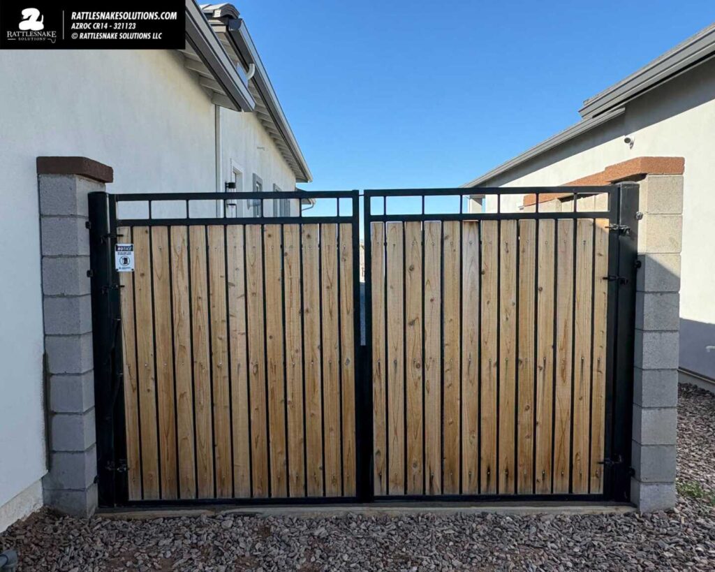 Rattlesnake Fencing applied to this double gate and along the back fence … and a bunch of the details in between. This backyard is ready for rattlesnake season.