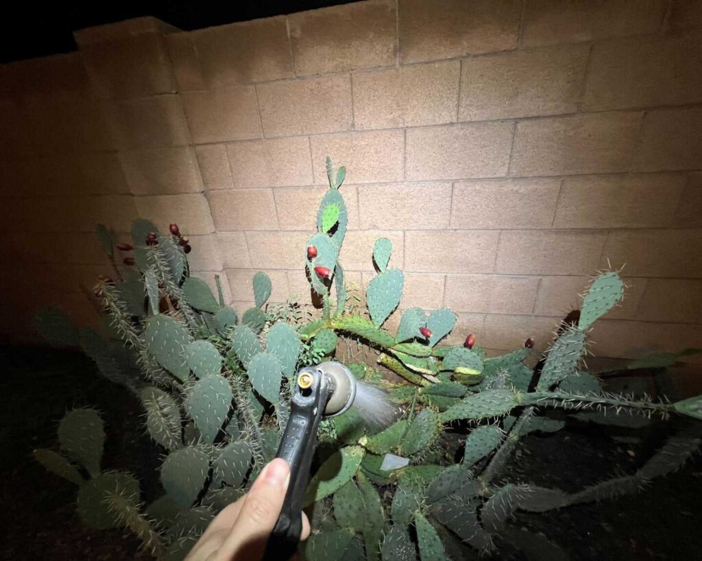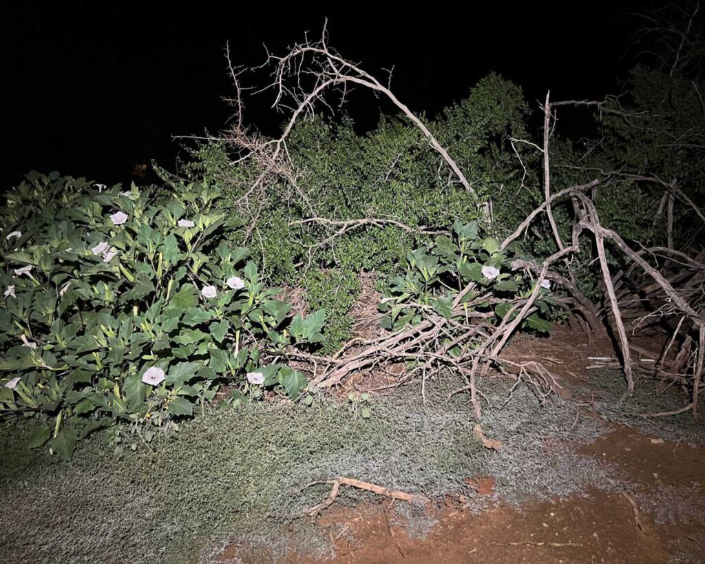 “This large-ish atrox (Western Diamondback Rattlesnake) made me work for it. It slipped my tongs and scrambled behind a patch of Opuntia where it seemed to have made itself a little shelter. Customer let me start removing pads off of it but still no luck getting ahold of it. Decided to flood and it slowly made its way out where I was finally able to secure it safely. This snake was fairly deep into the neighborhood so I suspect it may have been living in that yard for a bit. Took it to some desert surrounded by freeways but found it a dense packrat nest shaded by a desert hackberry and clumps of Datura. North PHX.” – CJ