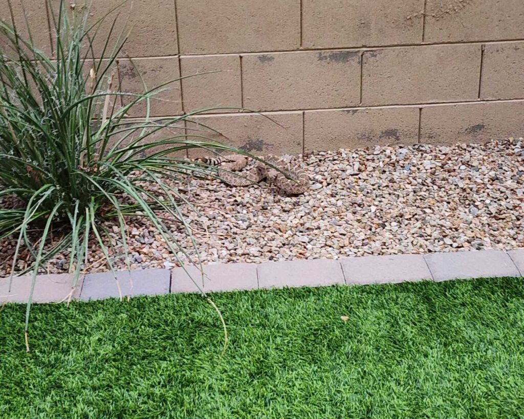 A Western Diamondback Rattlesnake in a small backyard in north Phoenix. The homeowner had just finished cleaning up after the dog before kids went out to play. Soon after, she saw her cat being curious about something, so she went to investigate. The cat was only a few feet away from this snake (it’s ok). Cheyenne went to help and got the snake to a better spot.