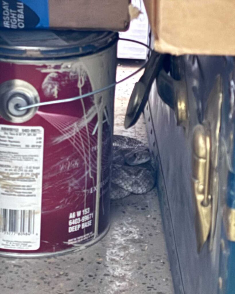 From Jon: This beauty found its way into a cool garage, likely from the door being left open for a short time. The homeowner initially spotted just the tail sticking out from under one of the cars and was able to keep an eye on it as it moved to another area of the garage.