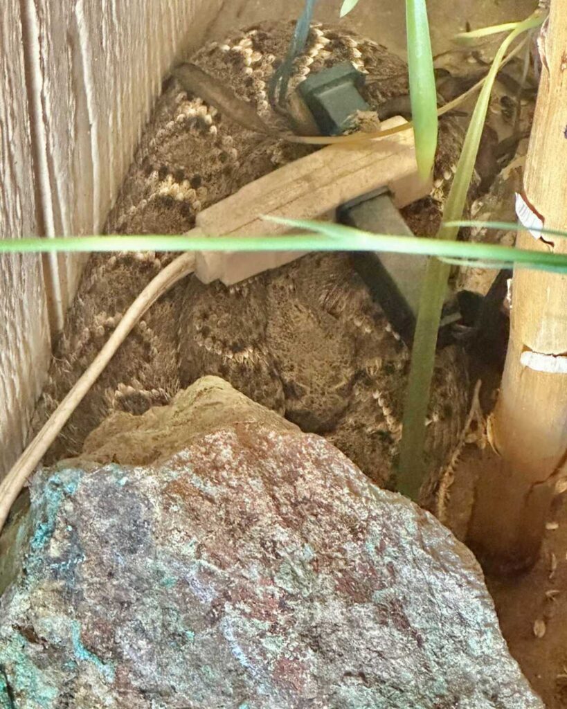 A call came in for a rattlesnake on the front porch. The homeowner was no stranger to rattlesnakes, as we have been to the property several times in the past. This one was tucked in between the back corner next to a rock and some decorations. There was a water bowl for lizards and birds within a couple of feet of the snake, near the front door, which was likely the reason the snake was there. Josh went out to capture the snake and relocate it to a deep rock crevice within its natural home range.