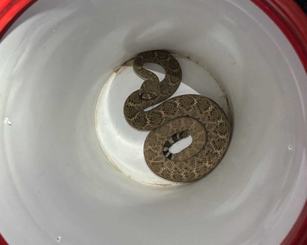 The homeowner’s son was jumping on his trampoline when he noticed a Western Diamondback coiled up nearby. He quickly alerted his parents, who were able to keep an eye on the snake until we arrived. The property had plenty of dense landscaping and sits directly next to the Agua Fria drainage, which provides excellent habitat. A packrat nest in the dry section of the riverbed offered the perfect, and likely familiar, cover for the snake to be relocated to safely.