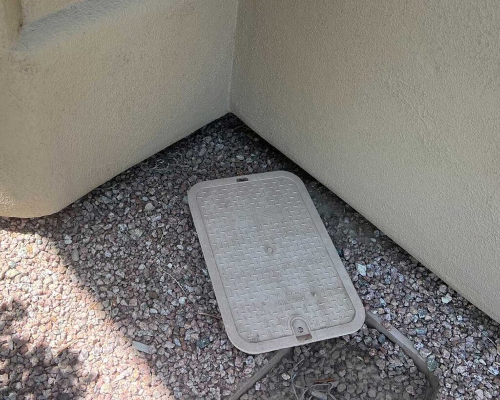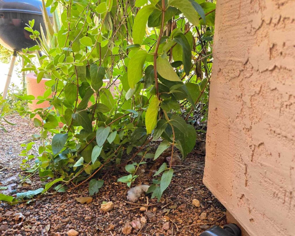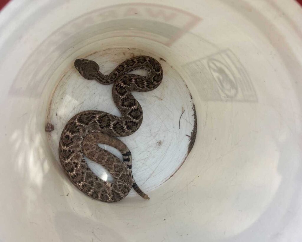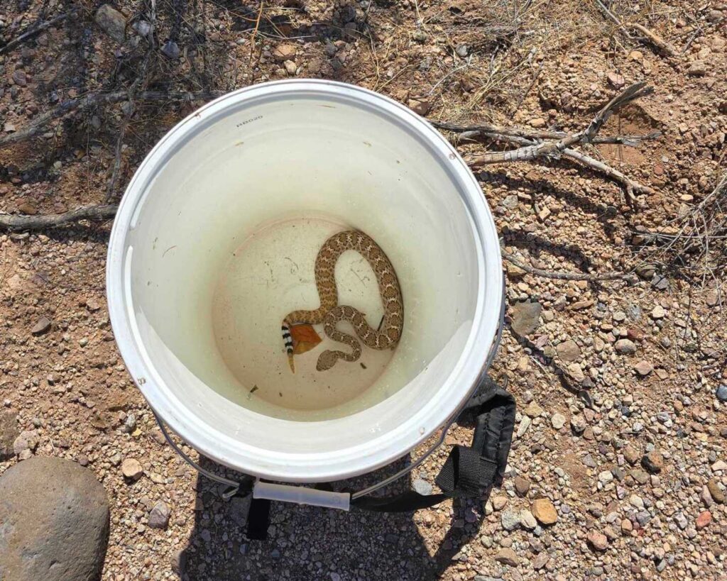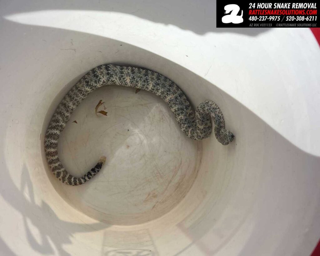 Landscapers spotted this adult Western Diamondback Rattlesnake coiled by the water box … and left the area immediately. Marissa went out to catch the snake, and noticed she’d been at the same house a week prior to get a snake in the same spot (not the same snake!). The home has a decorative fountain in the front yard, which is likely an attracting feature to the thirsty snakes living in the preserve across the way. The water box also had some moisture in it, making for an easy spot to drink, stay cool, and hunt rodents looking to do the same.