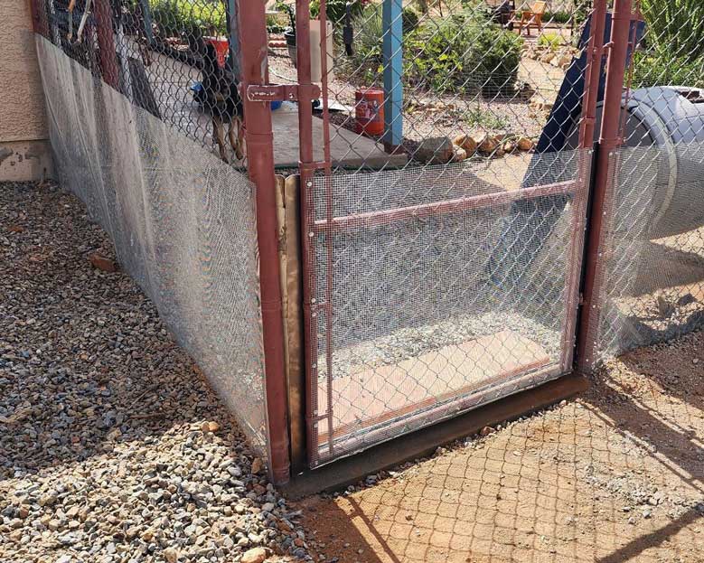 Rattlesnake Fencing applied to this double gate and along the back fence … and a bunch of the details in between. This backyard is ready for rattlesnake season.