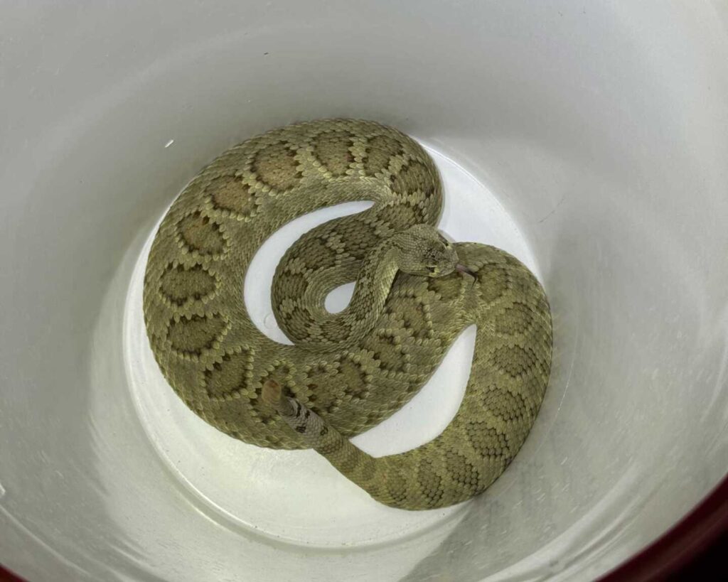 Austin relocated the snake to suitable habitat within its estimated home range, placing it into a rodent hole at the base of a large bush.