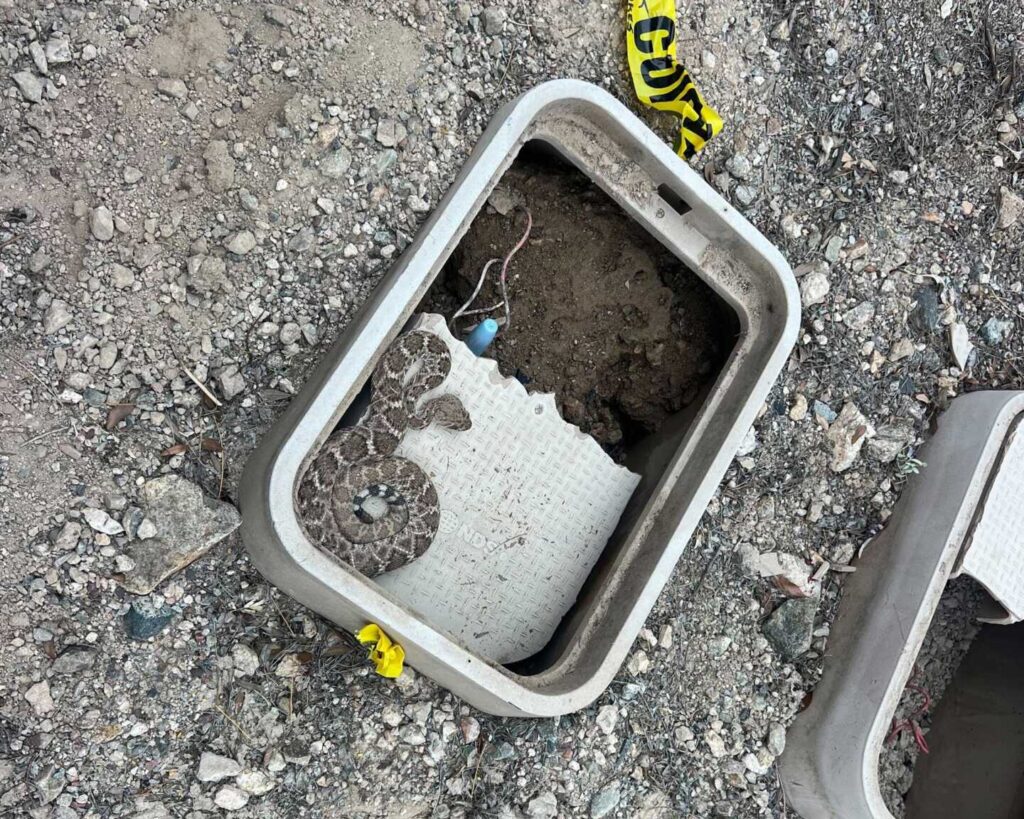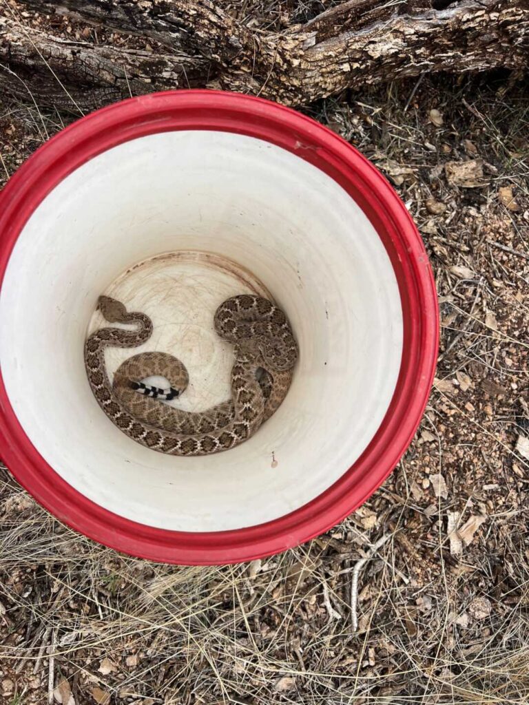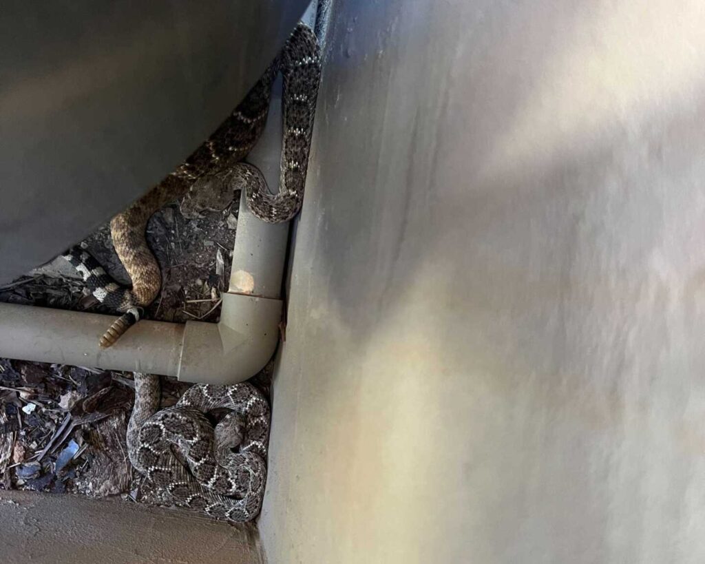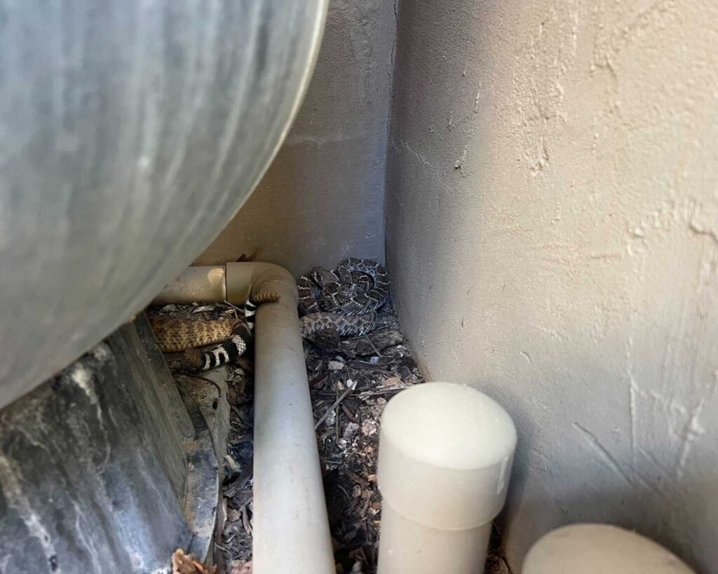 The dog was barking at something in the backyard, and it ended up being a pair of mating Western Diamondback Rattlesnakes. The home is surrounded by a view fence, with open desert all around, and was a perfect candidate for rattlesnake fencing. – Rio Verde, Arizona