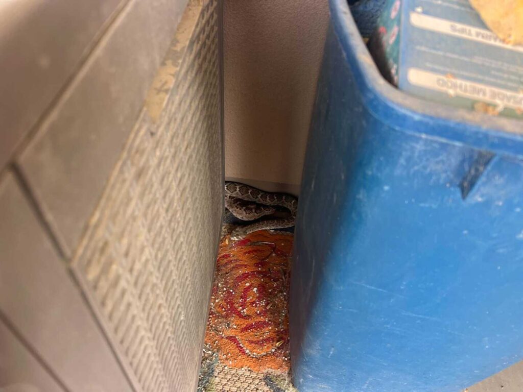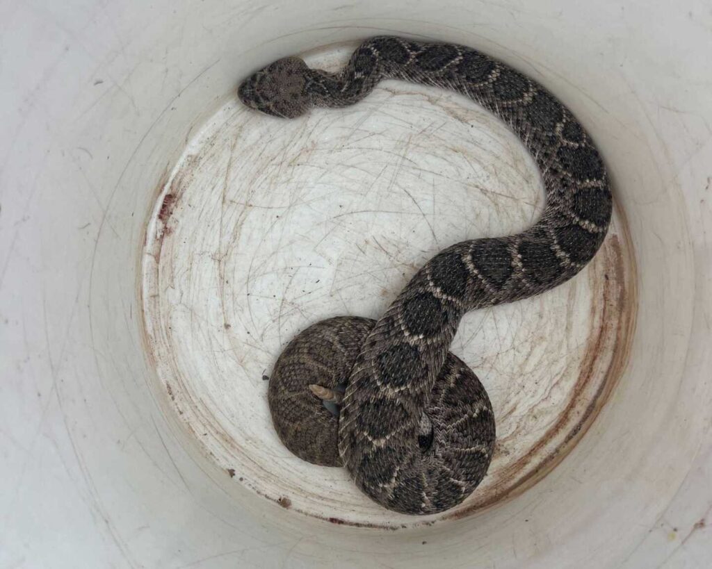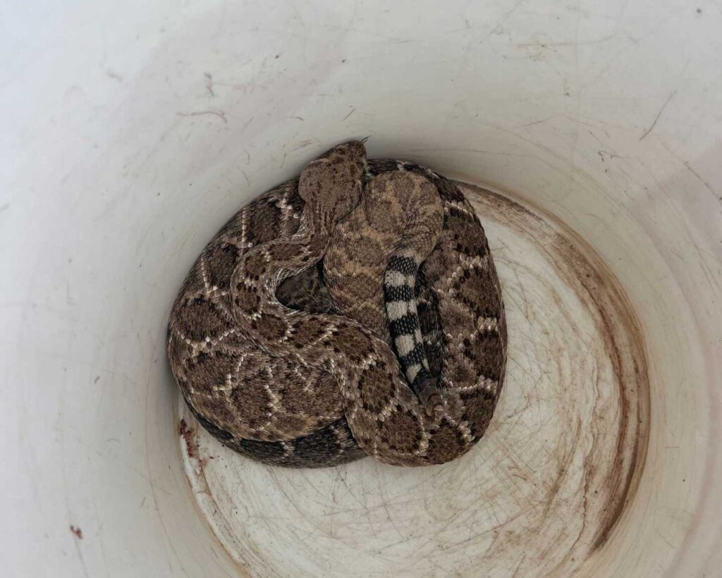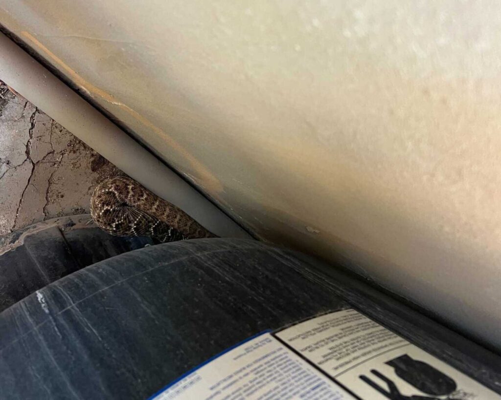 The dog was barking at something in the backyard, and it ended up being a pair of mating Western Diamondback Rattlesnakes. The home is surrounded by a view fence, with open desert all around, and was a perfect candidate for rattlesnake fencing. – Rio Verde, Arizona