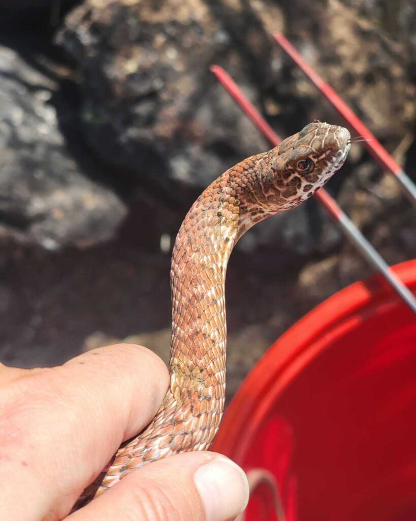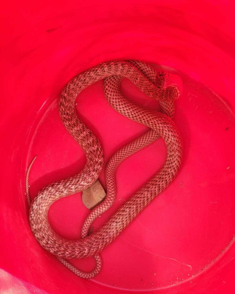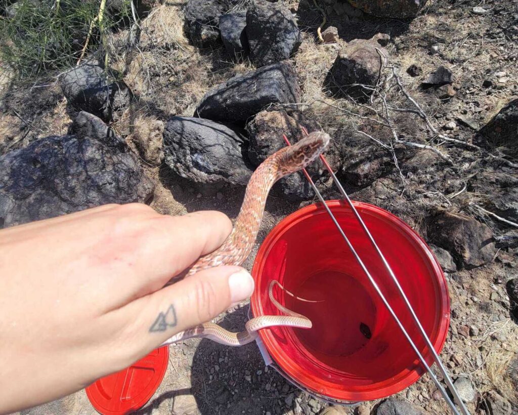 This beautiful Sonoran Gophersnake decided to take a siesta under an outdoor grill and was fast asleep until Jon gently interrupted. With several pockets of desert scattered throughout the neighborhood, there are plenty of places for snakes to move through and settle in. Jon safely relocated it to a good spot and released it into a gopher burrow within its estimated home range, though it was a little too quick to dive in for a release photo.
