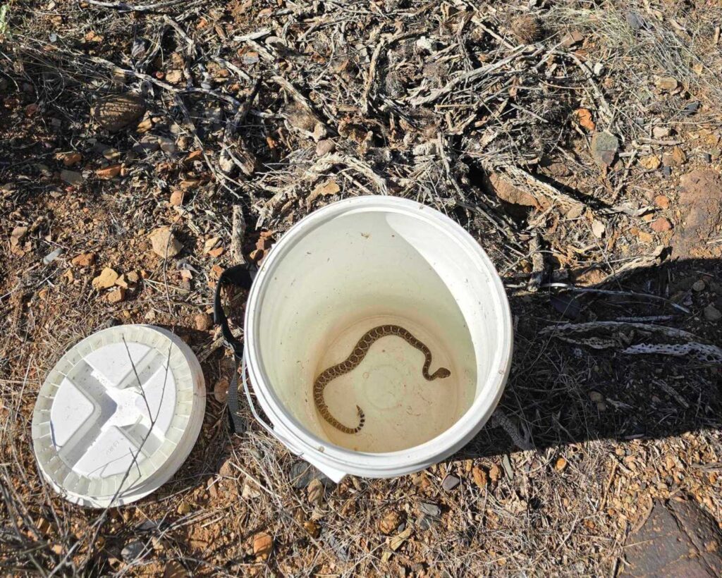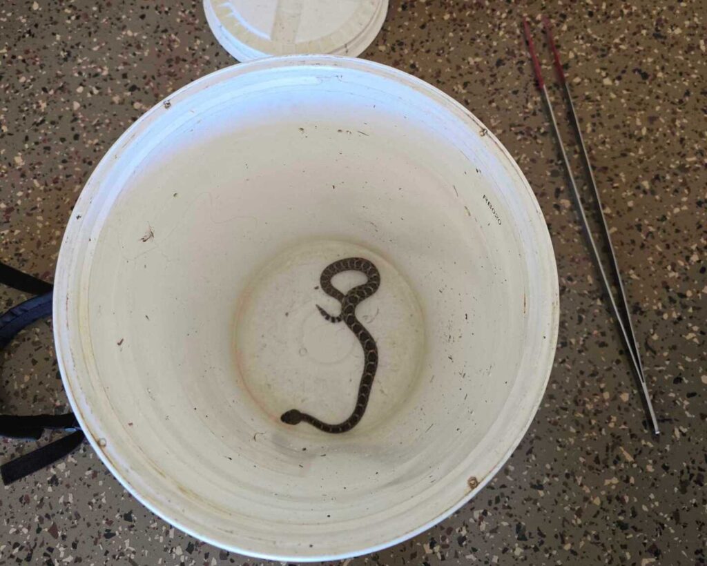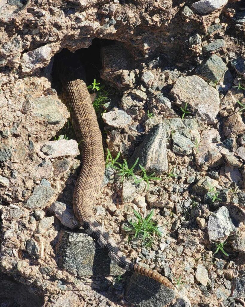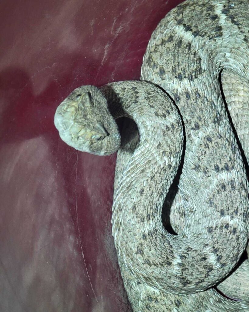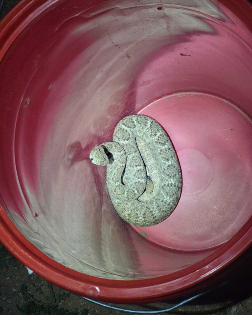 A small Western Diamondback Rattlesnake was seen hiding in the garage, where it likely intended to spend the winter. It disappeared but Apryl was able to find it nearby, under a shoe rack, and safely capture it. She took it to season-appropriate microhabitat for it to continue its life.