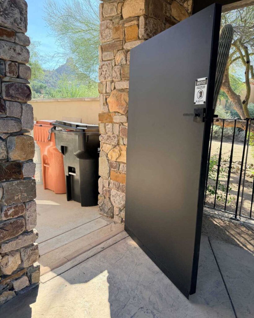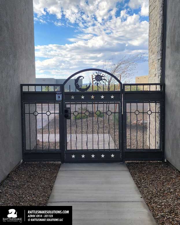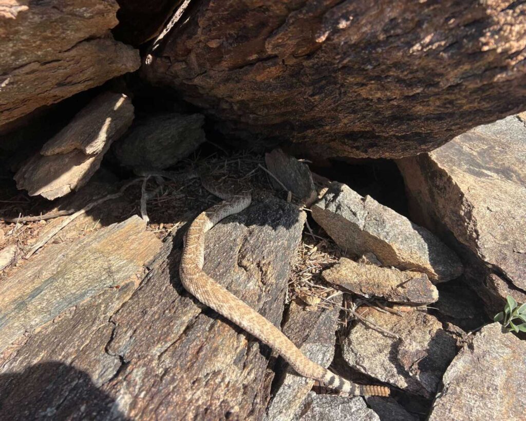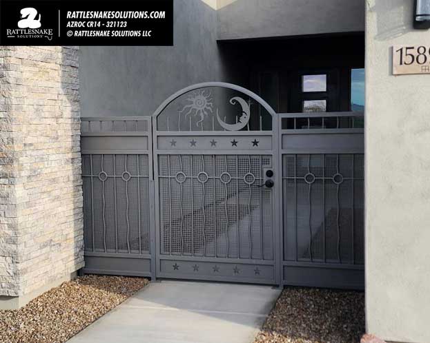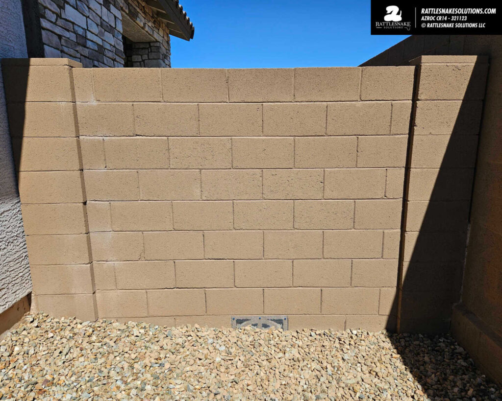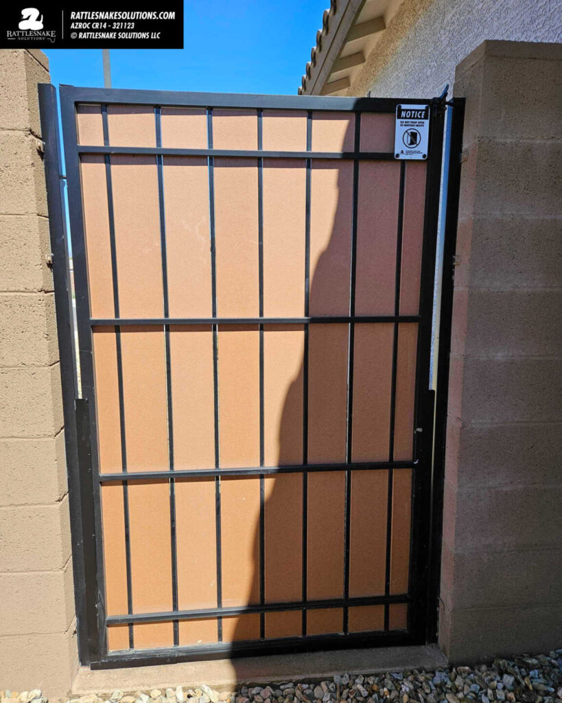A tight installation of rattlesnake prevention materials to this patio gate from Daylan and Elias. It’s a shady spot by design, which can’t be ignored by wildlife that are also looking to get out of the heat. Covered patios emulate natural locations where rattlesnakes can naturally be found aestivating during the summer, and snake fencing is an effective way of making sure there are no surprises.