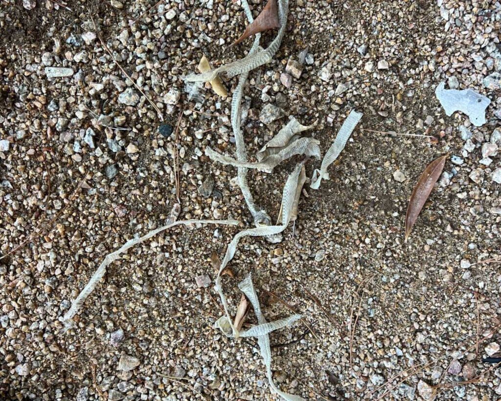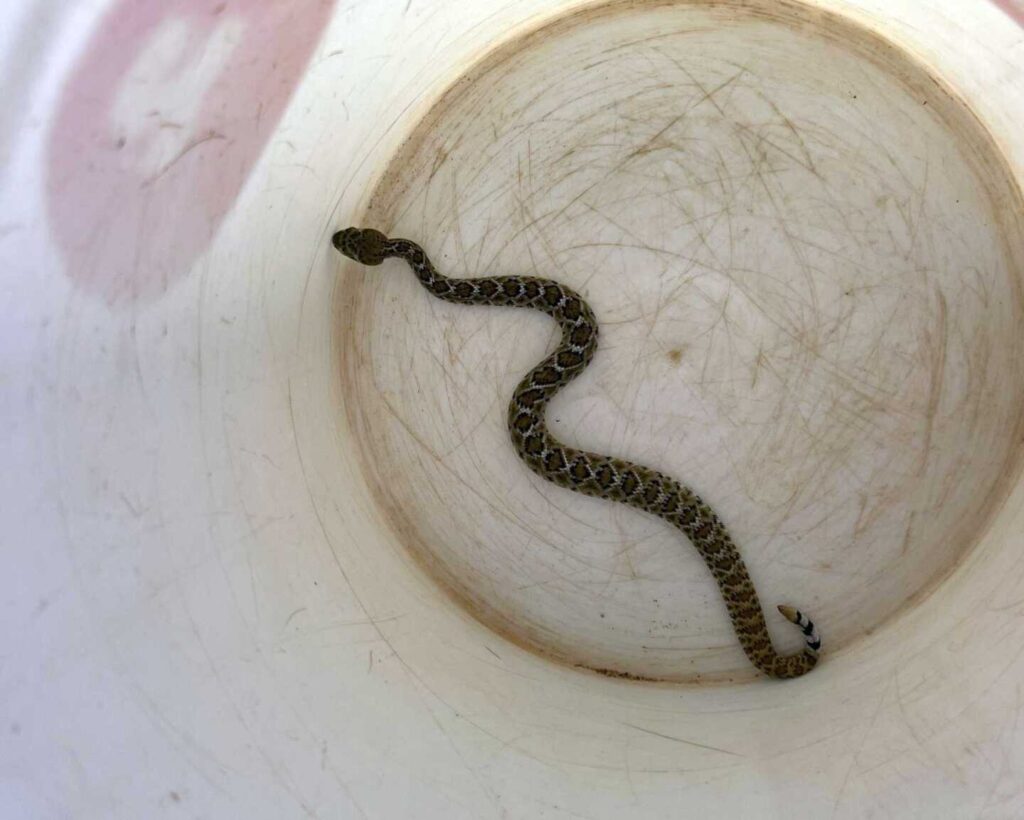 The homeowner spotted a baby rattlesnake on her front walkway a few nights ago. She captured it and relocated it. Then the night after she had another by her garage. She got that one and relocated it also. Last night she found a third one and put it in a bucket and called us. I looked around by where she kept finding all the snakes and I found 5 baby rattlesnake skins under a bush by the front of her home. There was a hole and no one came out when I watered it. I searched around the front and back and didn’t find anymore snakes. The home backs up to a big drainage and some good desert not far away. The front yard had some good hiding spots with heavy vegetation and stacked rocks. The back yard was pretty cleared out. It seems like the rest of the babies and mom found another spot to hang out. Scottsdale