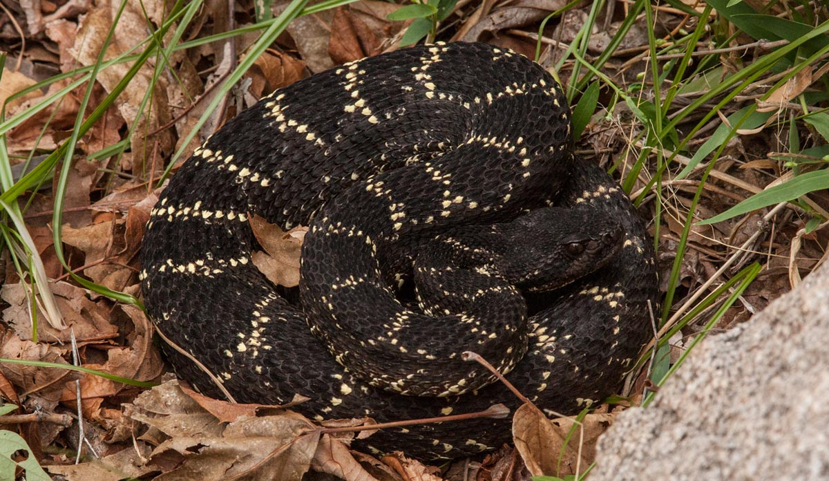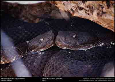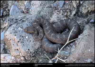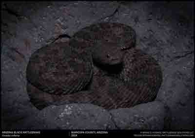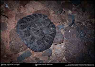 The Arizona Black Rattlesnake is sometimes mistakenly referred to as “Timber Rattlesnake” throughout its range due to generally being found at higher altitudes in wooded areas. They are commonly seen in mountains north of Phoenix. This is a thick-bodied, large rattlesnake. Coloration is light as a young snake, being tan or grey with brown circles down the back. As the snake matures, it will darken to a deep brown color to completely black. They can also change color to some degree, becoming more light or dark depending on various circumstances. This snake can deliver a large amount of highly toxic venom and should be left alone if encountered.