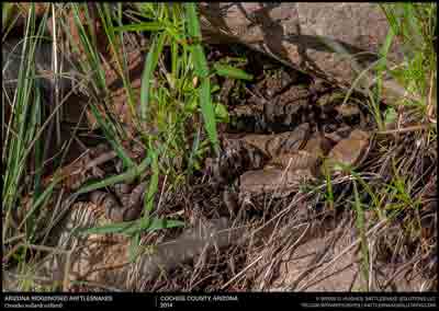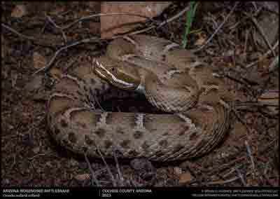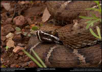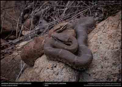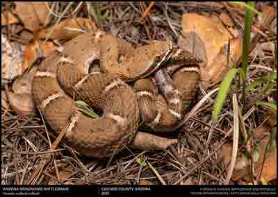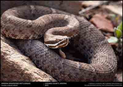 The Arizona Ridgenosed Rattlesnake is the Arizona state reptile. It is one of three protected rattlesnake species in the state, due to limited range and collection by poachers. It is a relatively small snake, with adults seldom exceeding 2’ in length. In the U.S., it is found in only a handful of mountain ranges in the “sky islands” region of Southeast Arizona at elevations above 4,000’. It lives in Madrean Woodlands and adjacent grassy hillsides. This individual is one of a pair collected under permit from AZGFD to represent the species in educational presentations, and provide legal, captive-born specimens to Arizona educational programs.