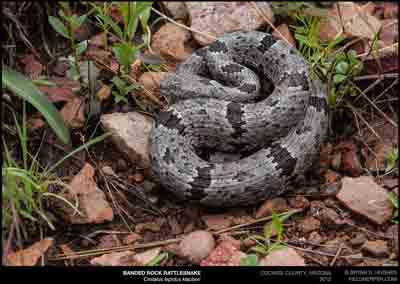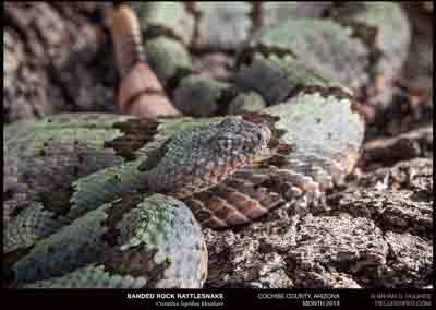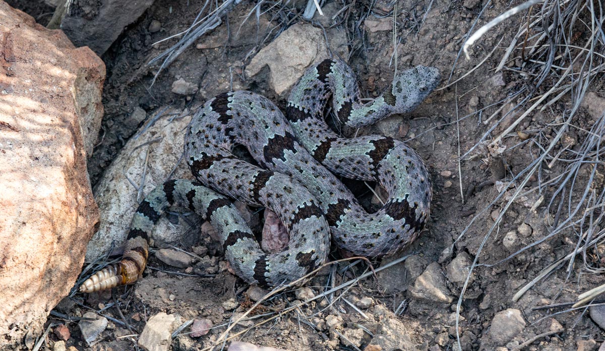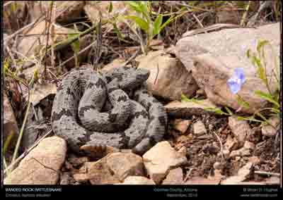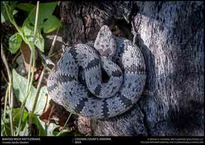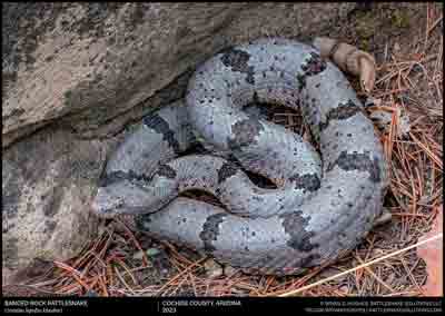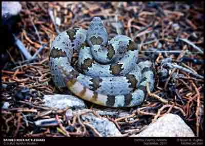 The Banded Rock Rattlesnake is a small, specialized species of rattlesnake that lives in the mountainous “sky islands” region of extreme Southeastern Arizona. As its name implies, it is found in association with rocky areas, canyons, and woodland with sun-exposed outcroppings. The banded rock rattlesnake usually has a grey base coloration, and a series of black bands, sometimes with a very bright teal or green outline. Males can be be green, often nearly metallic in appearance, with varying amounts of pink or blue-grey. Protected throughout its limited range in Arizona, this snake should be avoided.