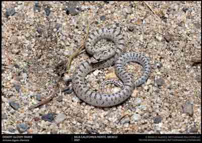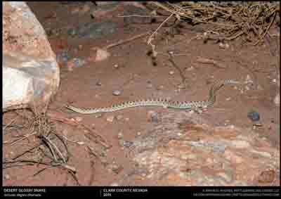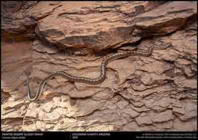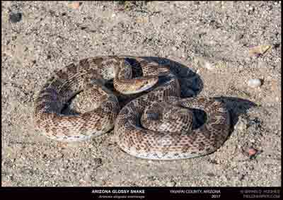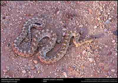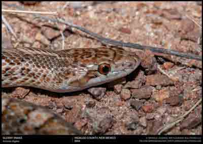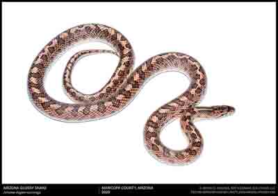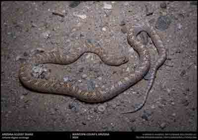 These are medium-sized (up to about 3' long) snakes that are often confused with the similar-looking Sonoran Gophersnake. As the name suggests, the Glossy Snake's appearance is often shiny or, well, glossy, due to a lack of ridge (keel) on each scale as is found in the Gophersnakes. Usually brown and tan, oranges and pink colors can be found as well, especially in the Painted Desert (Arizona elegans philipi) subspecies. They are harmless, but may attempt to bite and rattle their tail defensively. While they are common in the sandy soil and grasslands where they live, they are relatively elusive. Of species found within the metro-areas of Phoenix and Tucson, they are very infrequently encountered, with only a handful of individuals in our relocation records.