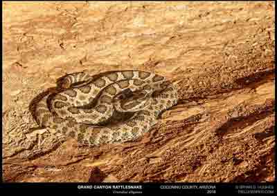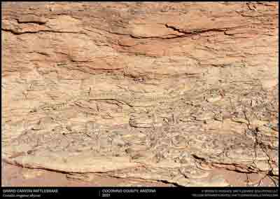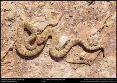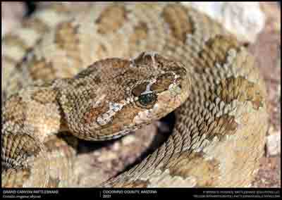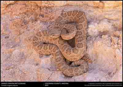 The Grand Canyon Rattlesnake is a medium-sized rattlesnake that can only be found within the Grand Canyon, Paria River Drainages, and Glen Canyon areas of Northern Arizona. The grand canyon rattlesnake is tan, yellowish, or pink in color; a good match for the colorful rocky areas that make up the majority of its range. This snake has a pattern of irregular blotches along the back, often with a dark brown outline. When born, the pattern is highly contrasted but fades as the snake grows. Mature adults can appear to be all but patternless.