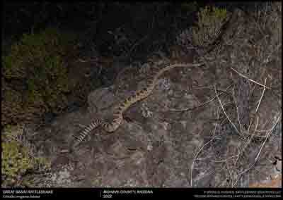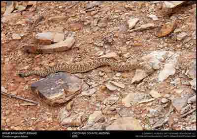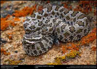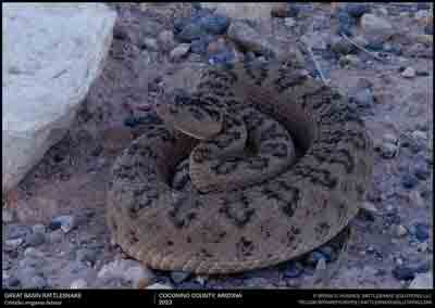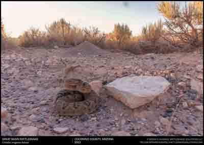 The Great Basin Rattlesnake is one of the widest-ranging rattlesnakes in the Western US, being found in AZ, CA, NV, OR, ID, and UT. In AZ, this snake is only found in the extreme North Western Great Basin desert and Arizona Strip regions, up to 8,000 feet in elevation. The “smudge” on the head is an easy differentiator between this snake and the other species of Western Rattlesnake (Grand Canyon and Midget Faded rattlesnakes). Extremely variable in color and pattern, they can be found in brilliant yellow, nearly black-and-white, brown, grey, and appear nearly patternless to high-contrast black and gold - all within the same community. This snake can top out at lengths of 5’ in rare instances, but most adults end up in the 3’-3.5’ range.