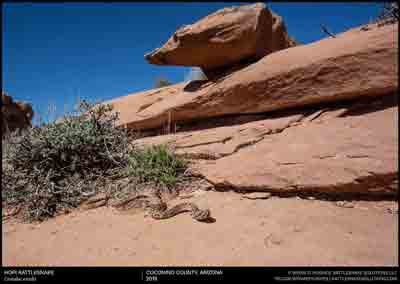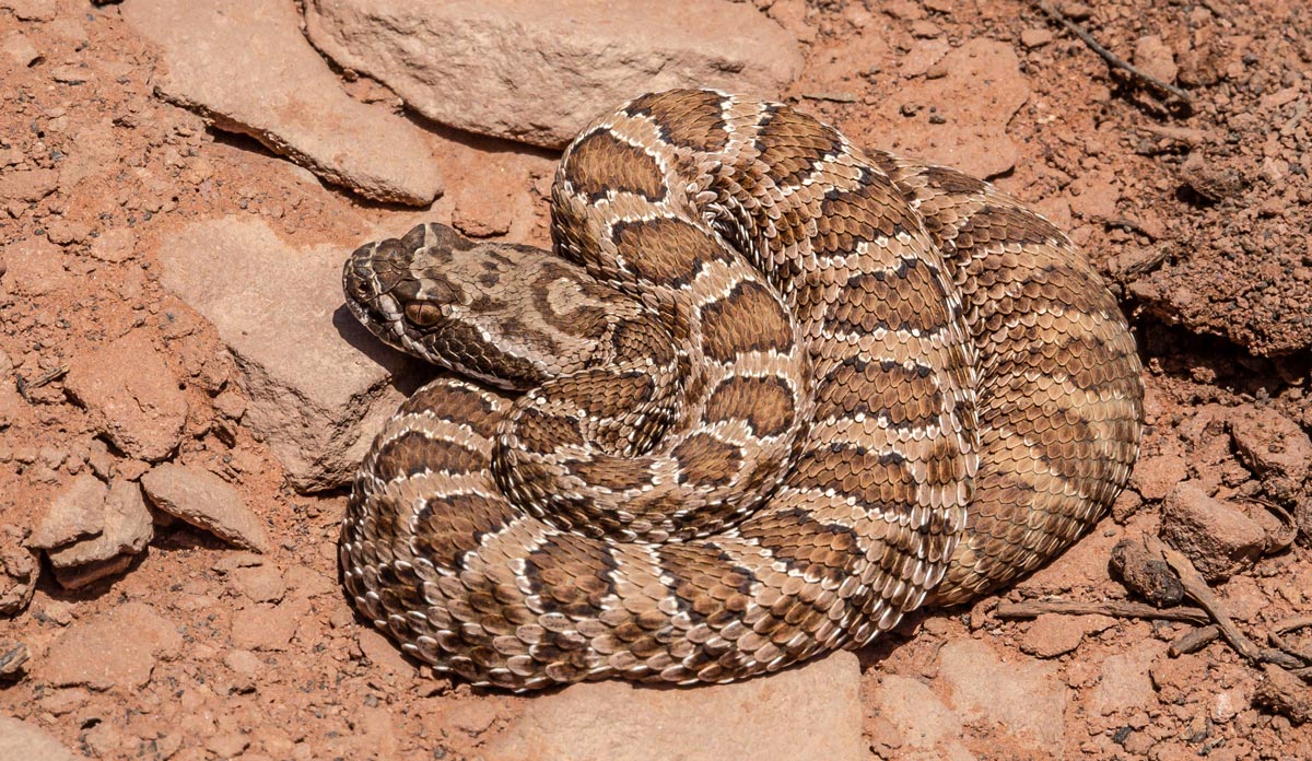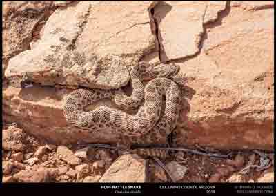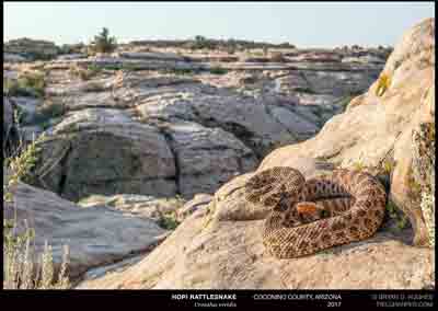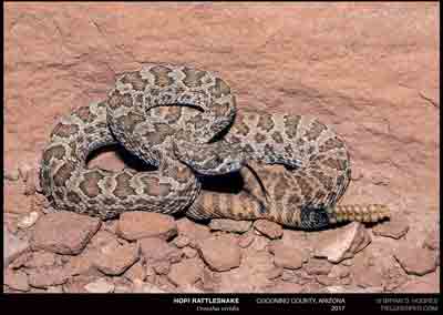 The Prairie Rattlesnake, (or Hopi Rattlesnake, depending on the area) is a wide-spread and extremely variable species, found in the North Eastern portions of Arizona, East of the Colorado River. Color, size, and pattern can vary greatly between communities, from small orange or reddish variants, or “Hopi” variety, to large-bodied, green, tan, or brown individuals. In Arizona, they are mostly found at higher elevations, between 4’500’ and 9,000’, inhabiting nearly every habitat type within their range. The Prairie Rattlesnake can be identified by the characteristically narrow light-colored facial stripes, and dorsal blotches that are often outlined oval or bow-tie shapes. They are often misidentifed as “Mojave Green” rattlesnakes in New Mexico and Northern Arizona.