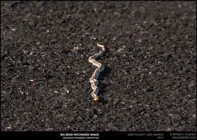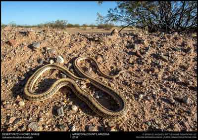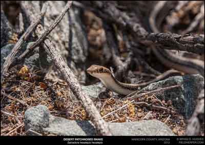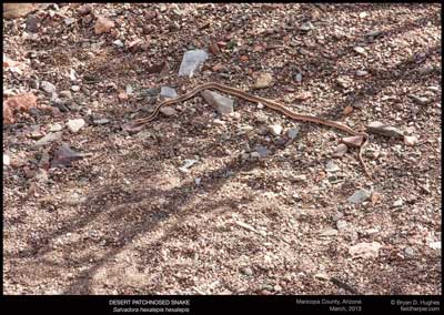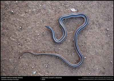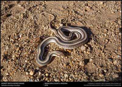 Western Patchnosed Snakes are most often encountered on dirt roads in the morning or late afternoon by hikers as they bask in the sun, then quickly dart off the road. They're slender, medium-sized snakes that get up to around 3' long. They're very quick, and most people only get a glimpse of them before they disappear, which often leads to misidentificaiton as a Coachwhip or Whipsnake. They're harmless, but might give a minor bite (some scratches) of picked up.
